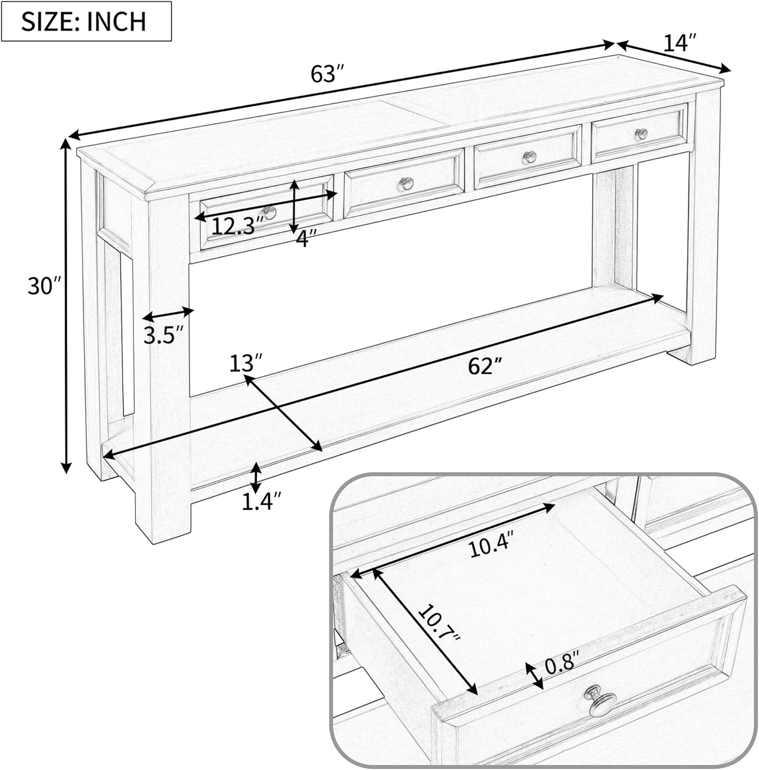 Solid Wood Console Table 63 in Long Sofa Table Entryway Table with 4 Drawers and Bottom Shelf for Hallway Living Room Couch Table,Fully Assembled,63" Tan