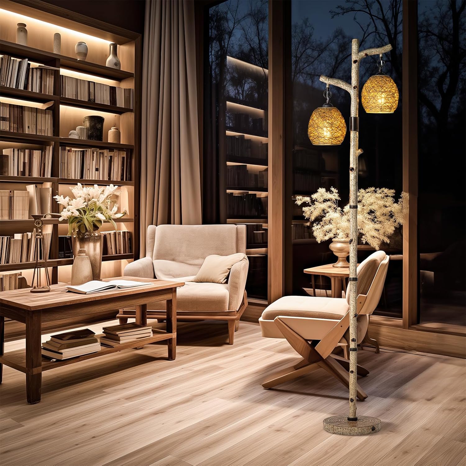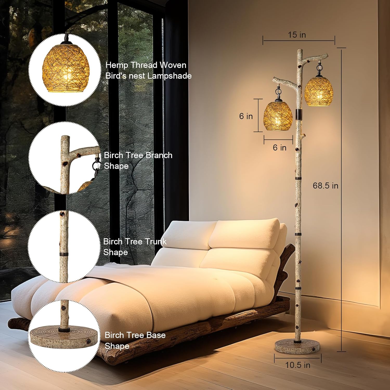 - Farmhouse floor lamp: This vertical lamp has a natural trunk design with a thick base and a beautiful reproduction of the birch tree appearance. The cute and delicate bird's nest lantern shade gives this tree floor lamp an elegant style. Perfectly decorate your bedroom, living room, villa, bar, hotel, farmhouse...