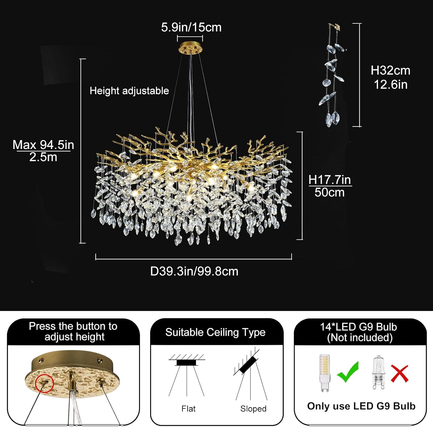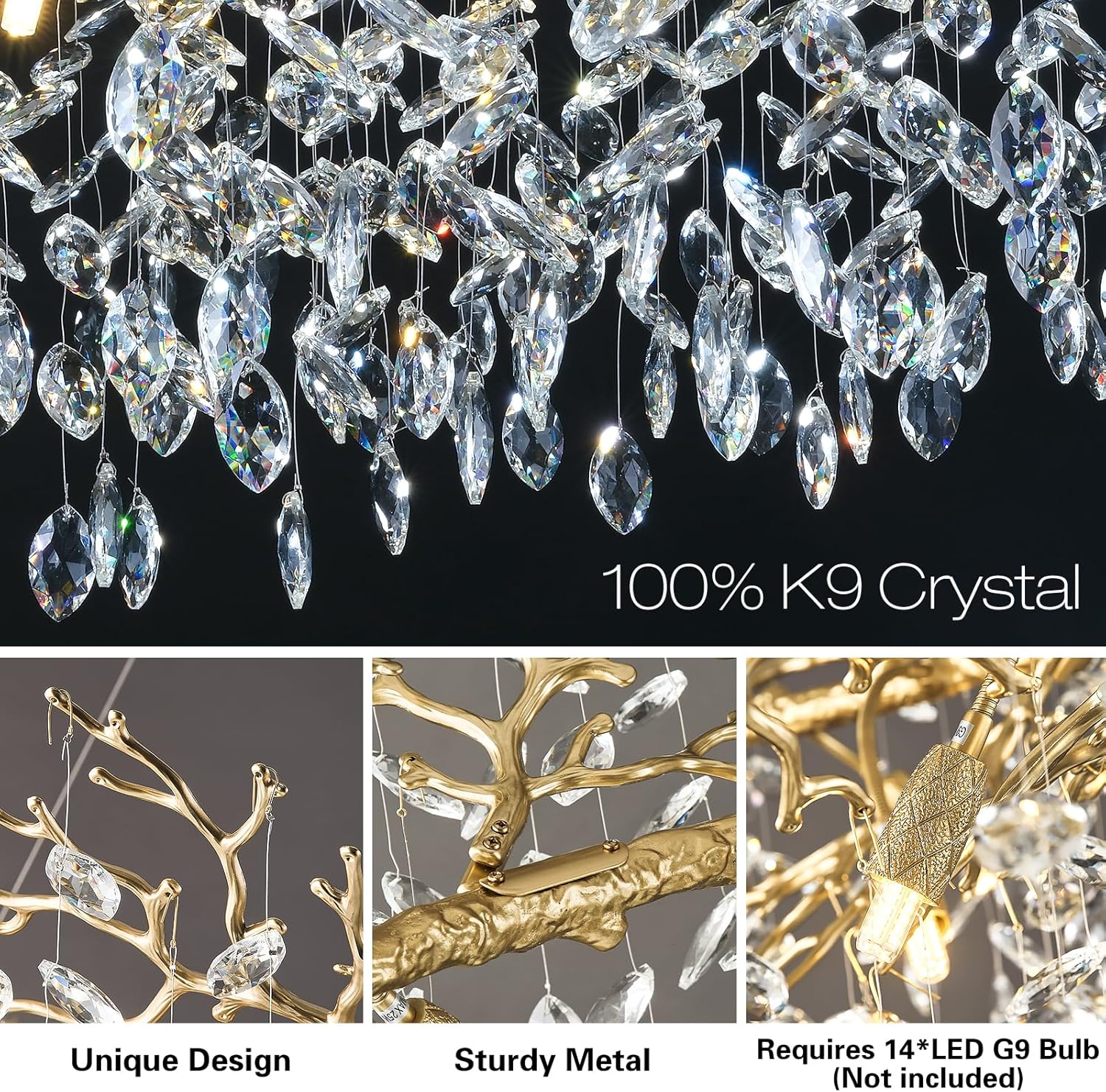 - Crystal Chandelier Light Source: This round crystal tree branch chandelier does not include light bulbs. It requires 14 G9 bulbs, which you can select based on your preferred color temperature to complement your home décor. For a warm and inviting atmosphere, we recommend using 3000K warm white bulbs. The chandelier is also dimmable when paired with dimmable bulbs and a compatible dimmer switch.