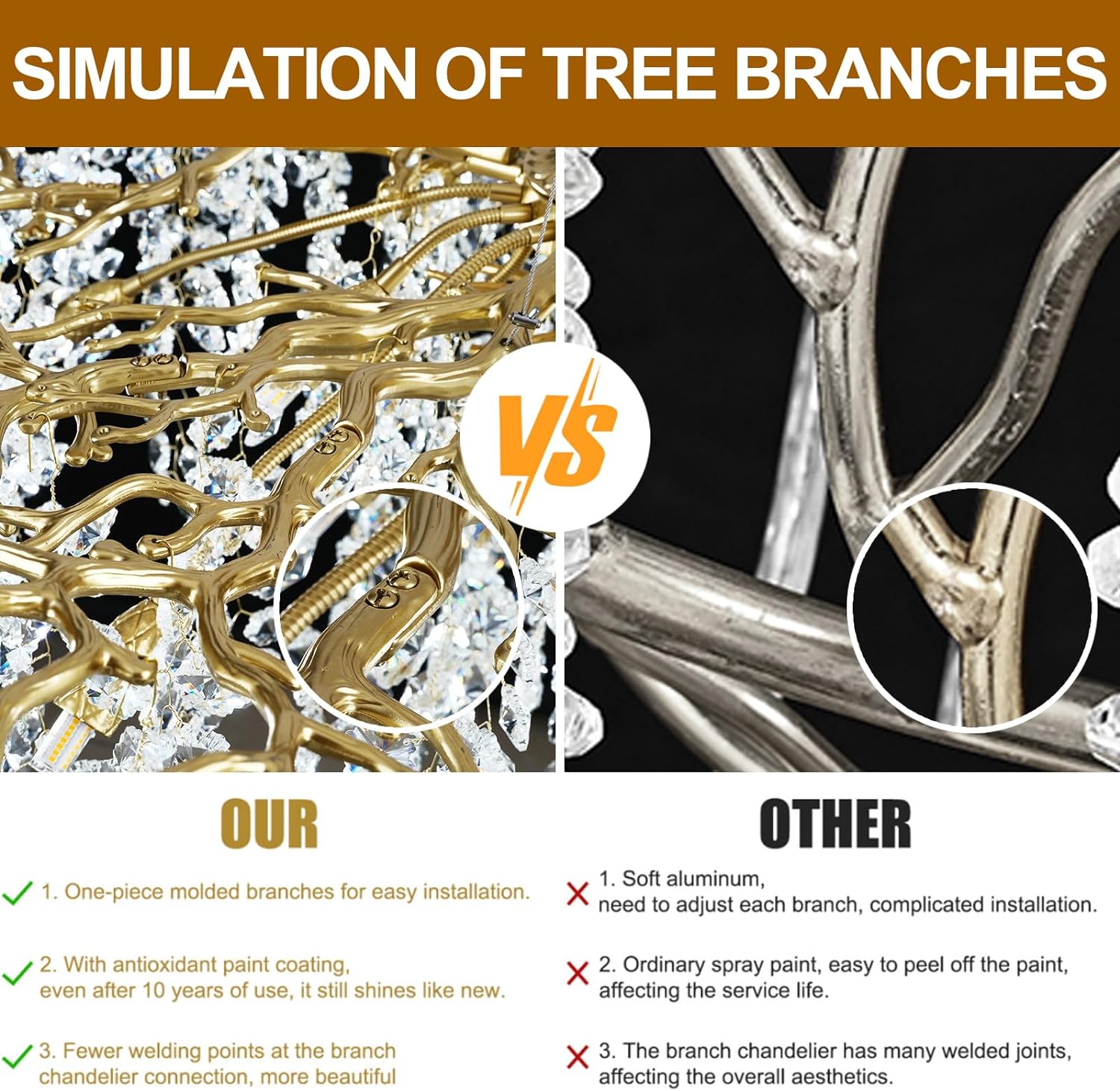 - Modern Crystal Chandelier: Transform your living space into a captivating masterpiece with our elegant crystal tree branches chandelier. This breathtaking design is inspired by the beauty of nature, featuring intricate tree branch motifs adorned with premium TOP K9 crystals. Each crystal captures and reflects light, creating a mesmerizing interplay of brilliance and shadow that elevates any room into a work of art.