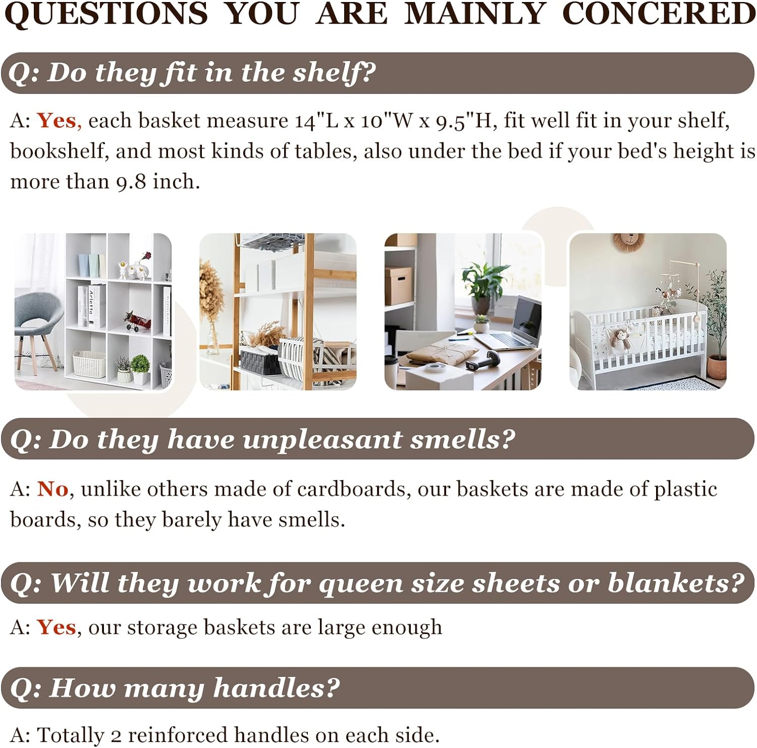 - 【PREMIUM QUALITY】 These bins for organization are made of stiff plastic boards on all sides and bottom, so these storage cubes could remain sturdy for years, stackable, and odorless in enclosed space. Durable non-woven fabric ensures these organizer baskets long-lasting. The organizer bin is stitched with 2 handles for a firm grip and easy carrying.