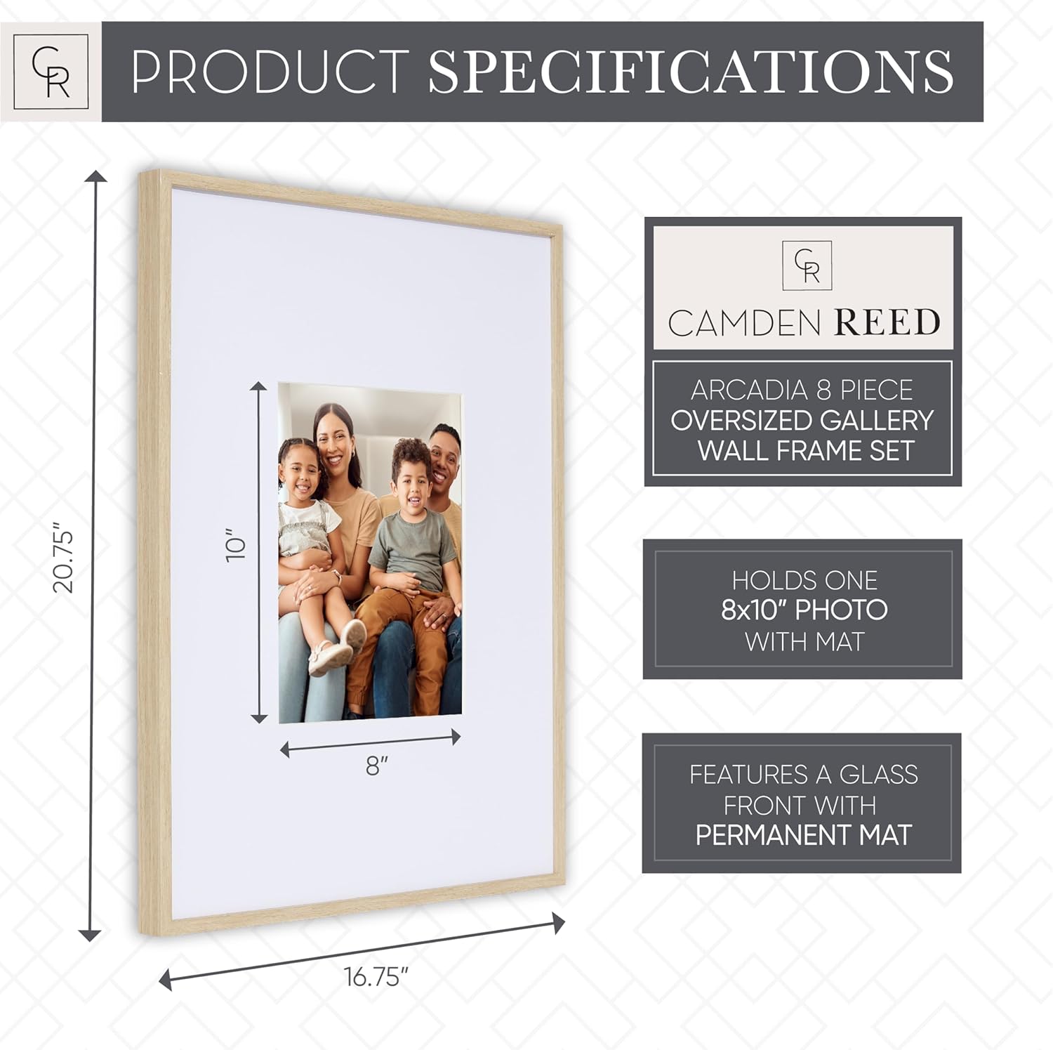 - Quality Construction– Camden Reed Arcadia Gallery Wall Frames are constructed of durable polystyrene, featuring a real glass front and MDF backing with attached hanging hardware and easy to use turn buttons. Each frame is finished in a modern natural and features a clean white mat that is permanently attached inside the frame to ensure your photos are well protected. The frames are meticulously packaged in a beautiful box, ensuring both their protection, and enhancing their presentation.