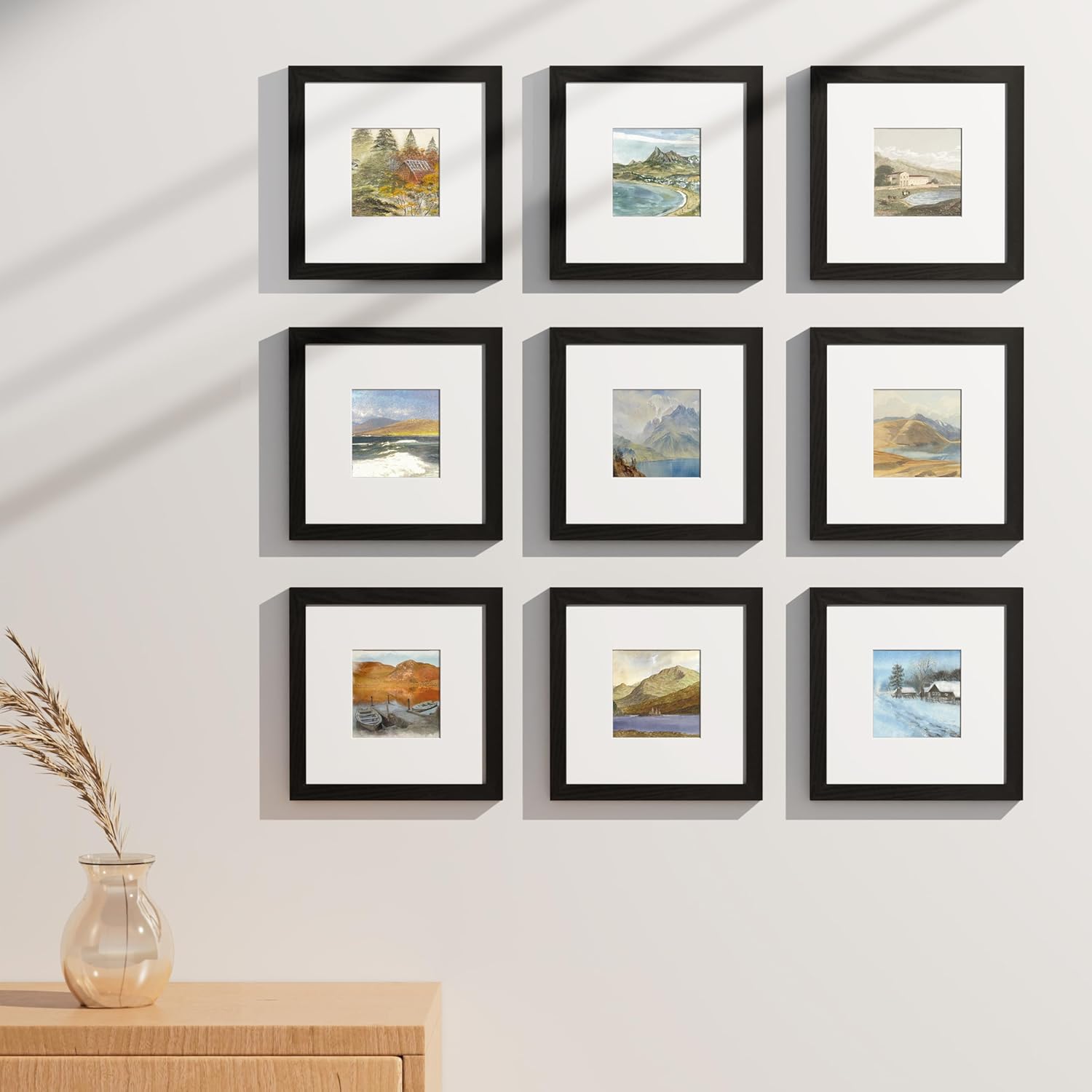 Vittanly 8x8 Picture Frames Set of 9, Shatter Resistant Plexiglass, Display 4x4 Pictures with Mat or 8x8 without Mat, Photo Frames for Wall Mount, Engineered Wood, Black