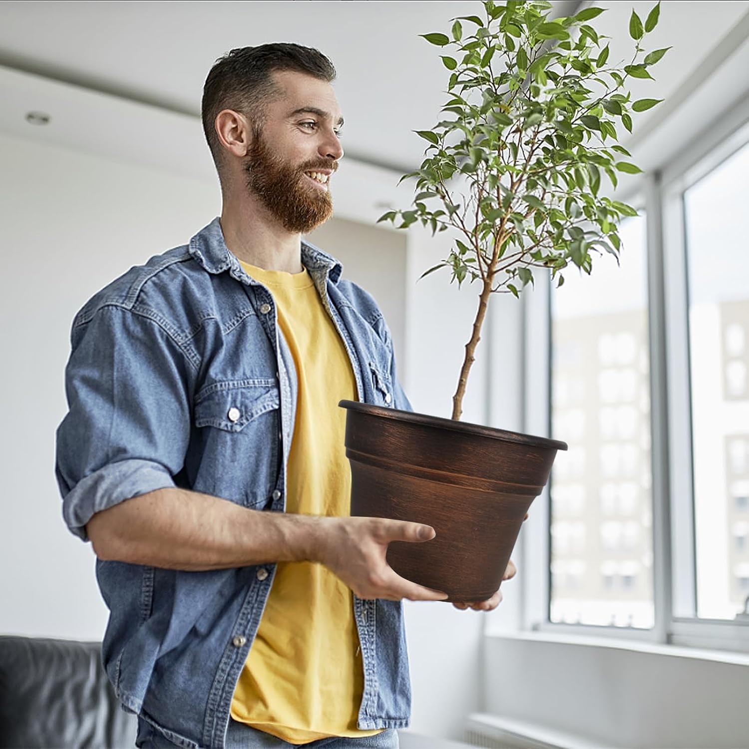 - 【TRADITIONAL DESIGN】Plastic planters for indoor plants with trays are designed in in dark gold colors & a classic look, which allow this pot to fit into any indoor & outdoor setting. With these golded flower pots, it could adds fresh, decorative flair to your home. Decorate your windowsill, desktop, shelf, bedroom, living room, kitchen, garden, office with our 13 inch large plastic plant pot.
