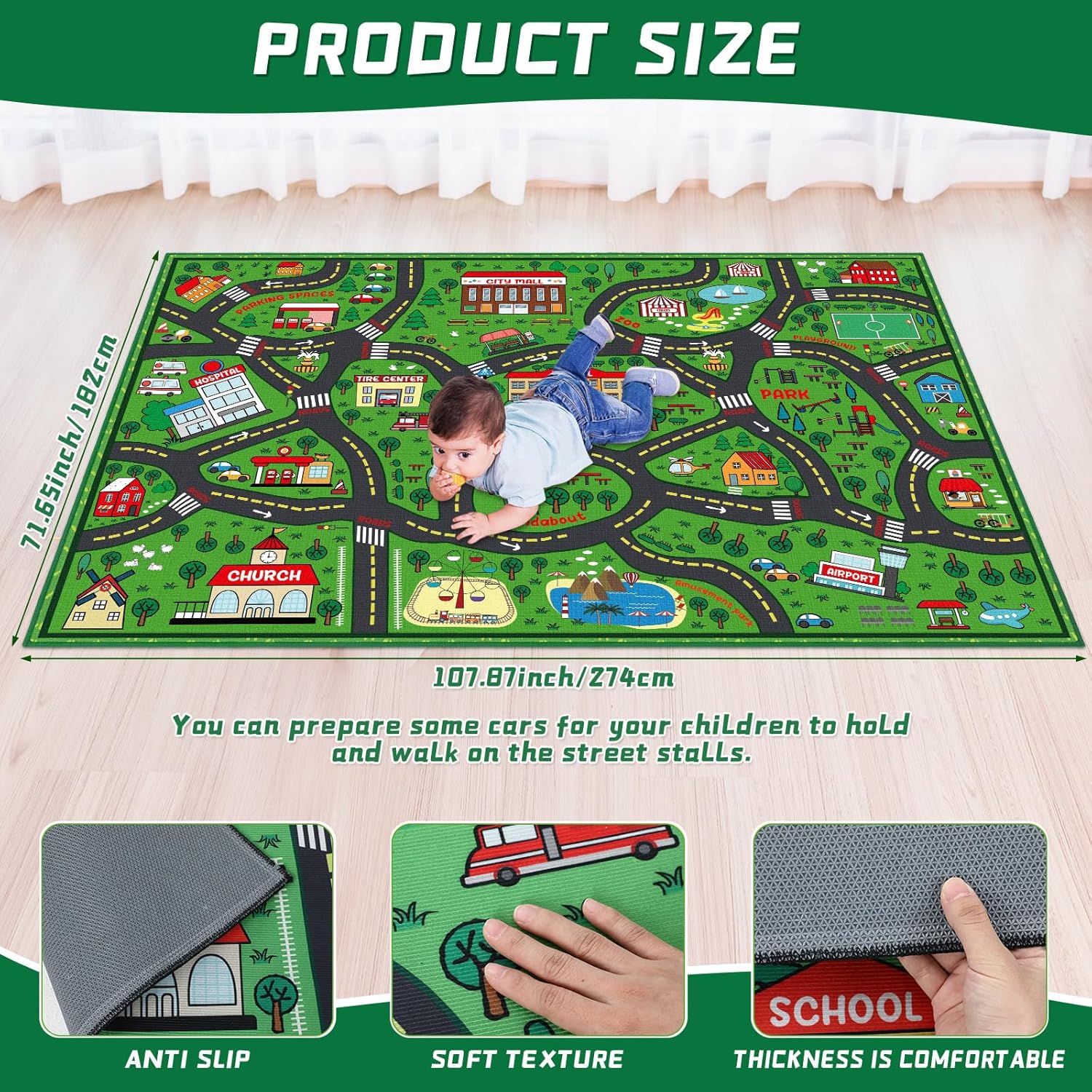 - Non Slip Kids Playroom Rug: this road traffic playrug featured with non slip and soft texture, provides a cushiony playfield that ensures safety during vigorous play; With a reliable non slip bottom, there's no risk of slipping or sliding; This kid baby and toddler friendly playrug ensure soft play times
