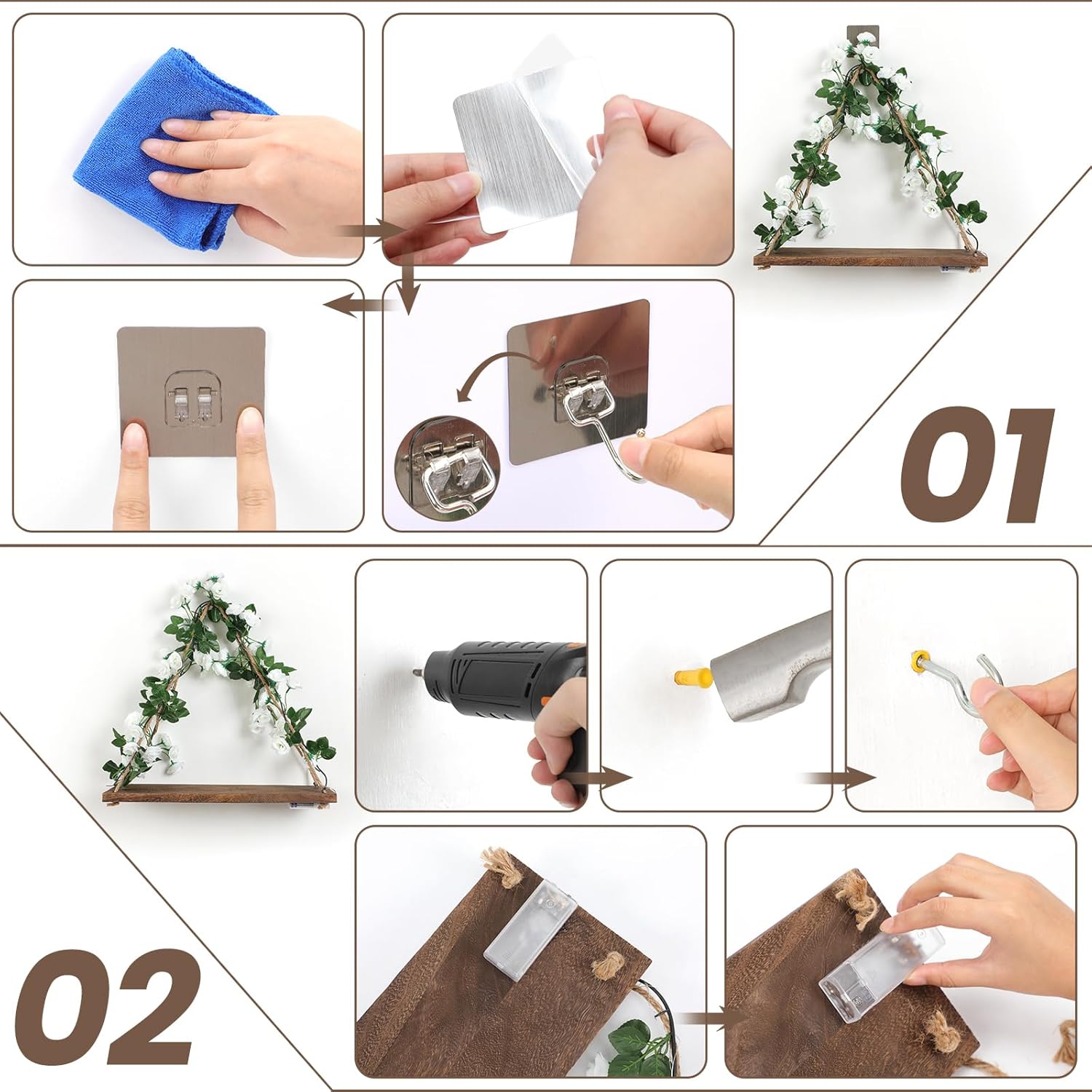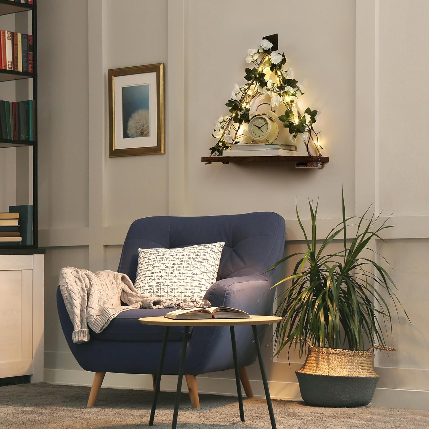 - Stylish and Functional: Crafted from high-quality engineered wood with a powder-coated finish, this triangular shelf features decorative green leaves, light strips, and the option for no-drill or drill installation. With a load-bearing capacity of 20 lbs, it can store and display plants, art accessories, collectibles, and more.