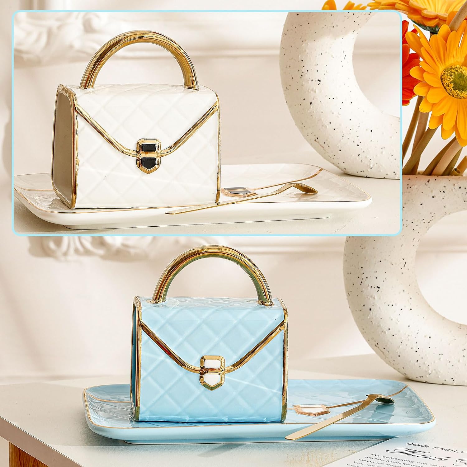 - Delicate Coffee Mug Set: the package comes with 2 pieces of handbag shaped blue and white mugs and they are equipped with 2 spoons and saucers, which is thoughtful set for your daily use; They are well packaged in a gift box, reading for your gift giving needs