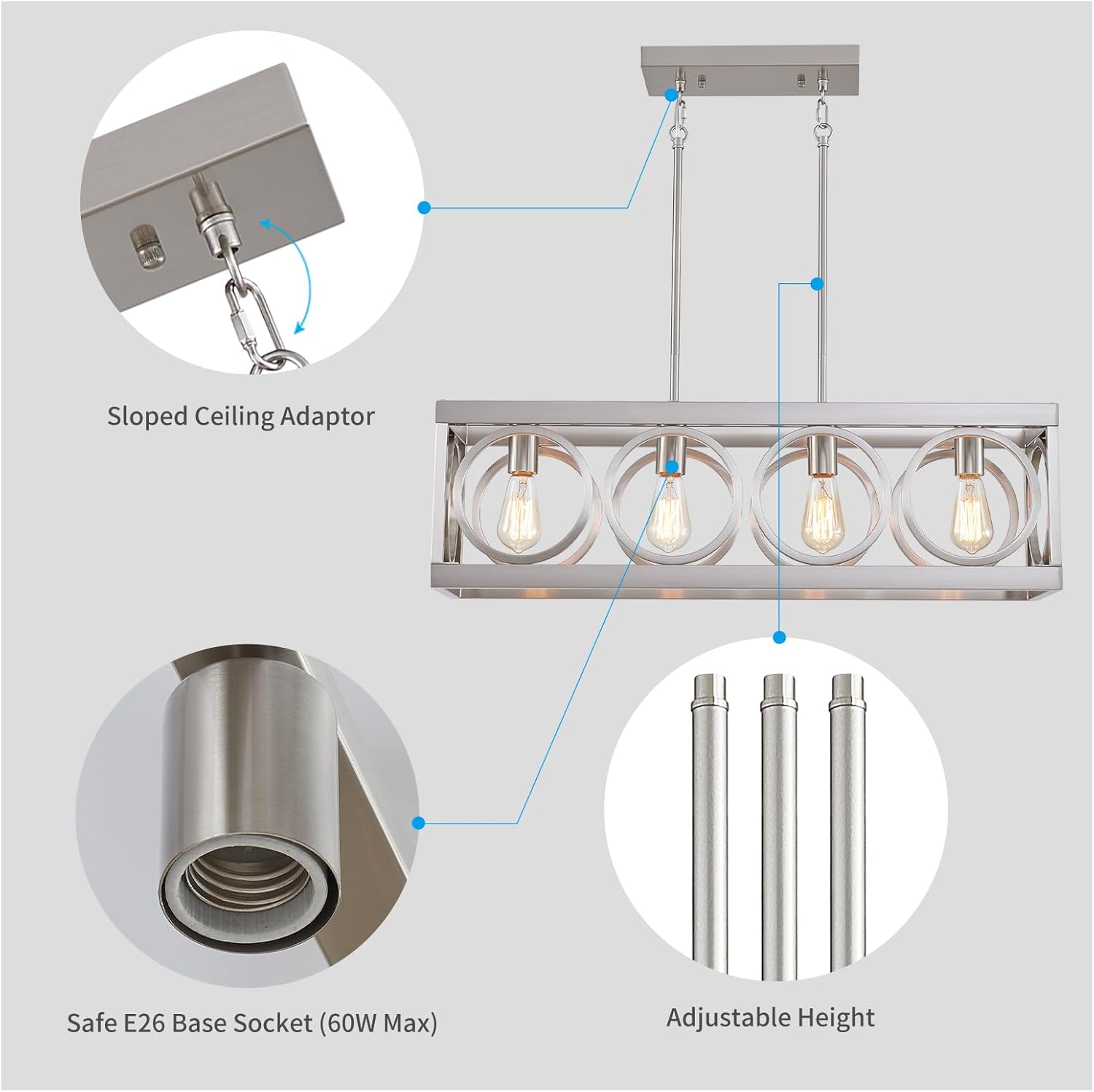 - ADJUSTABLE HEIGHT: This rectangular dining room light fixtures over table can be adjusted as desired to different ceiling heights. It comes with a sloped adapter available for both sloped and flat ceilings. You can customize the height to fit the needs of your space.