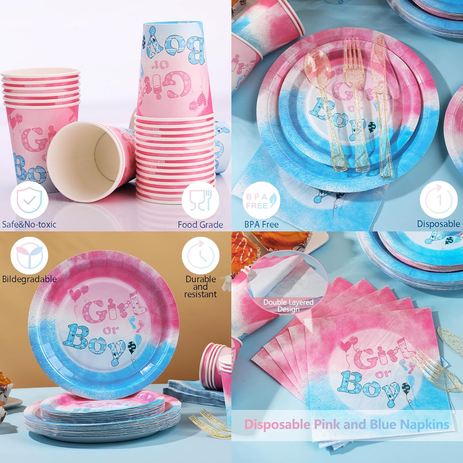 - 【Baby Gender Reveal Decorations 】-This gender reveal plates and cups and napkins sets can serve up to 24 guests. Includes 24 9in pink and blue plates 24 7in gender reveal plates, 24 gender reveal cups, 24 2-ply gender reveal napkins, 24 sets of glitter plastic cutlery (forks, knives, spoons). A total of 168 pieces are included. Such an ideal combination to save you extra energy and time to buy.