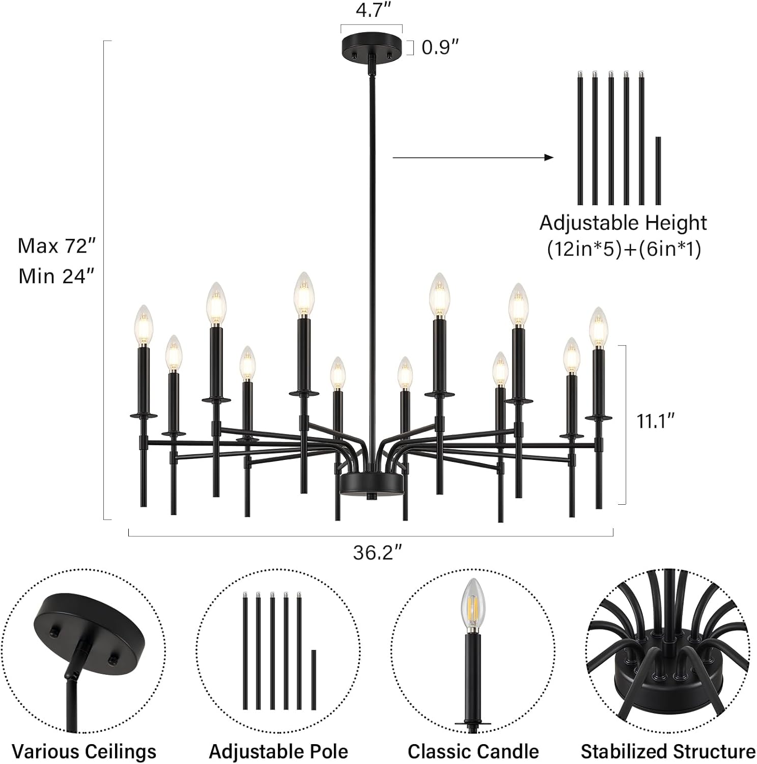 - Long Height Adjustable & Various Ceilings: Designed for versatility, the ZUYURT chandelier's adjustable poles (24 to 72 inches) and flexible canopy make it perfect as entryway chandeliers for high ceilings, and also suitable for living room chandelier in spaces with lower ceilings, including sloped surfaces. This black chandelier light fixture integrates seamlessly into any room, providing a adaptable solution for dining room chandeliers over table black or as a kitchen chandelier