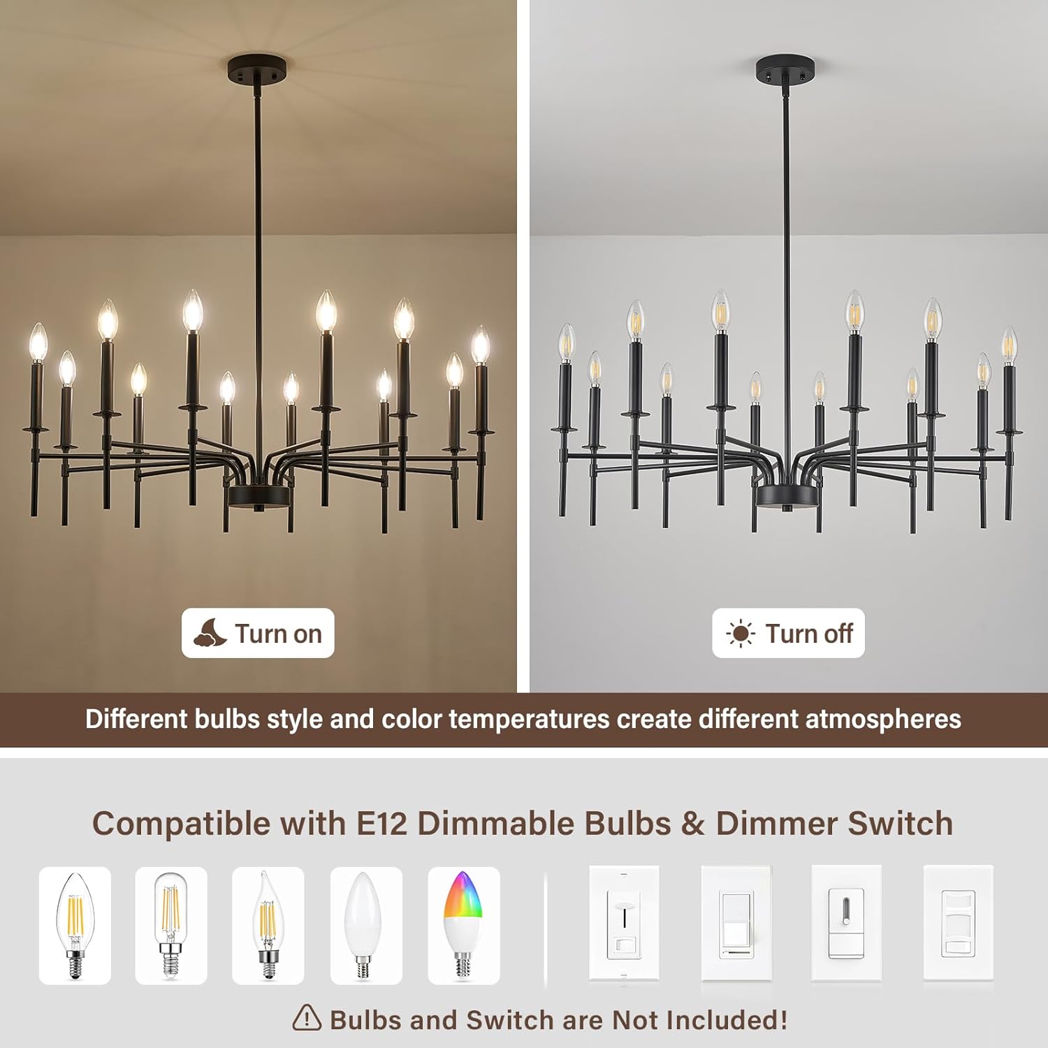 - Dimmable and E12 Bulb Compatibility: With 12 E12 candelabra sockets, this black chandelier is compatible with various E12 bulbs (incandescent, LED, CFL, and halogen, 40W MAX / bulb), offering dimmable functionality to create the perfect ambiance. This black matte chandelier allows for flexible lighting control, making it suitable as a black chandeliers for dining room, or master bedroom chandelier (NOTE: bulbs and dimmer are NOT included)