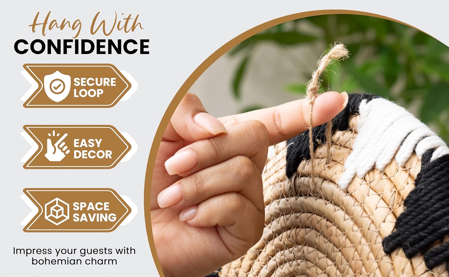 - ๐๐ฎ๐ฌ๐ญ๐๐ข๐ง๐๐๐ฅ๐ ๐๐๐๐ฎ๐ญ๐ฒ: Embrace nature and prioritize sustainability by using natural, eco-friendly and sturdy wicker wall art set. Crafted from 100% natural seagrass wall decor by skilled Vietnamese artisans, Each of our decorative wall baskets is adorned with macrame. Adding a unique, handmade touch to your wicker wall decor. These round wall decor are handmade and carefully woven as wicker wall basket.