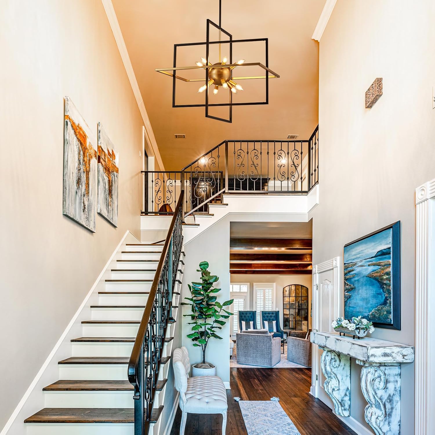 31.5'' Large Modern Lantern Chandeliers, 12-Light Black Gold Geometric Pendant Light Fixture, Industrial Hanging Chandelier for Entryway Foyer Hallway Dining Room, Kitchen Island
