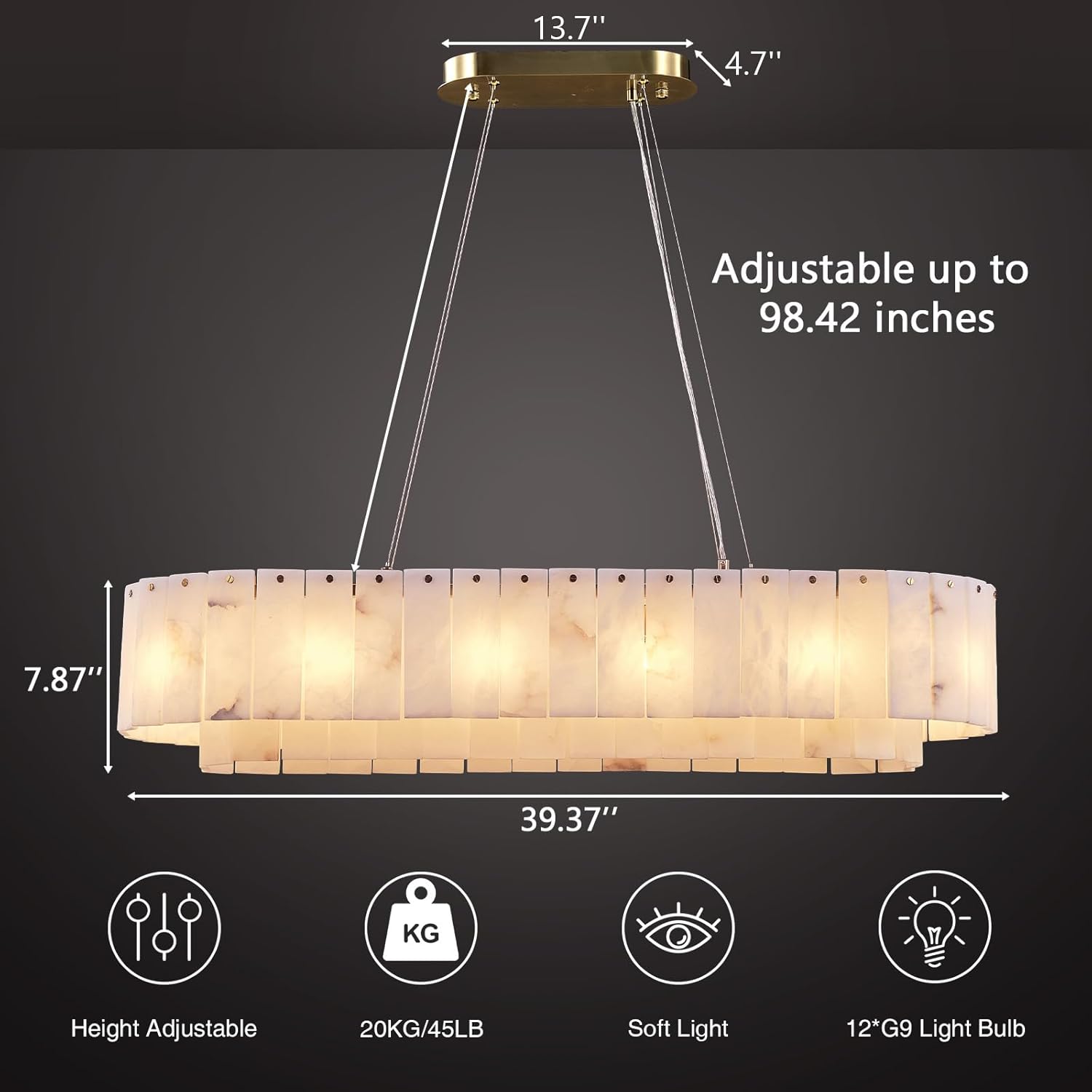 - 【Perfect Size & Adjustable Wire】The Rectangular pendant light is 7.87 inches high and 39.37 inches long, it weighs 45 pounds and comes with a 98.42 inch adjustable wire. It's the perfect size to enhance the ambiance of your room, allowing you to personalize the height to suit your space.