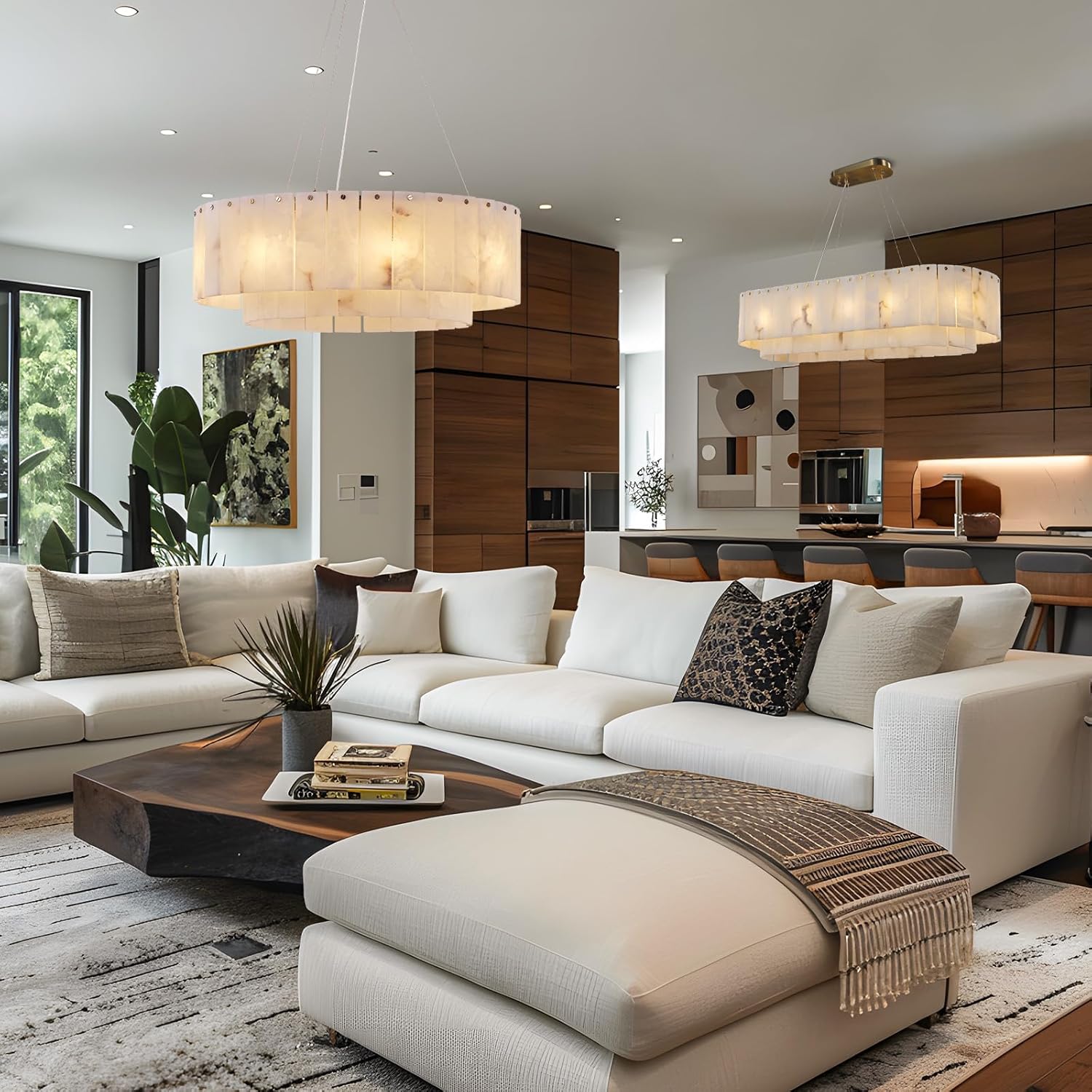 - 【Natural Alabaster & Unique Texture】Dining room chandelier is made of real natural stone. Each piece is carefully selected and hand-polished, which enhances the natural beauty of the stone while presenting a sophisticated and charming appearance. It is known for its unique patterns, which are marks formed by nature. Due to the differences in natural materials and handcraftsmanship, no two pieces are exactly the same.