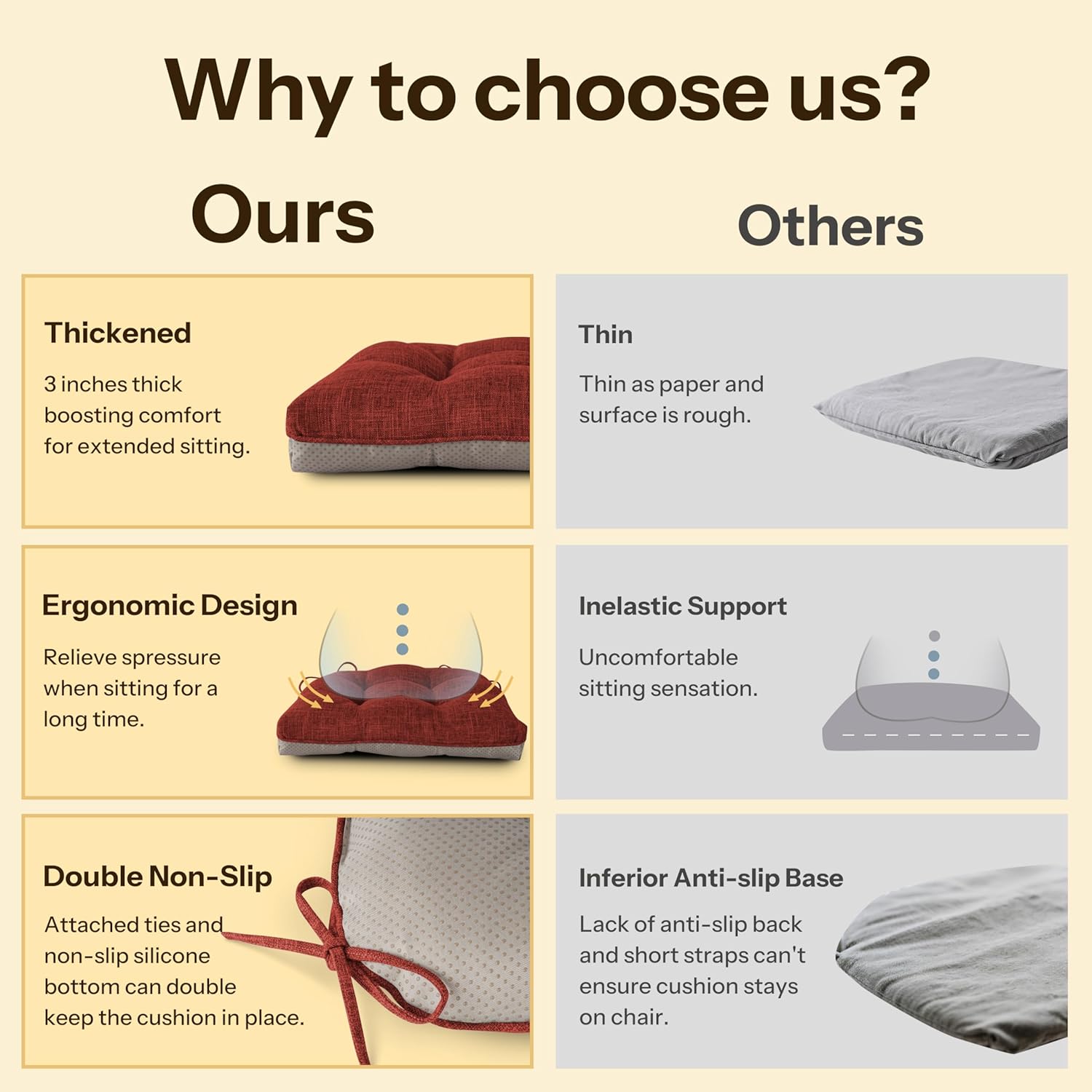 - Non-Slip Design: Designed with 33cm/13-inch straps and a non-slip backing, these chair pads won't slip or slide off your chair. They're easy to attach and non slip silicone bottom can prevent the dining room chair cushions from sliding around.