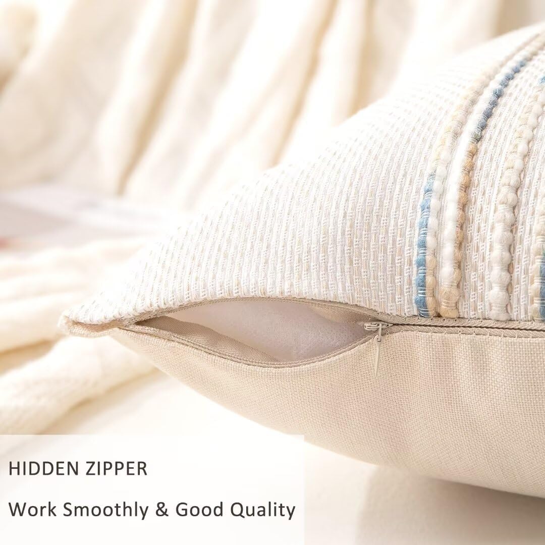 - Fabric: The stripe pillow case is made up of chenille and tufted on the front, and premium linen fabric on the back. Different styles on both sides offer you multiple decorative ideas. Sturdy stitching and careful hemming make the yellow and blue pillow covers durable and exquisite. The zipper pulls up smoothly and is not easy to break