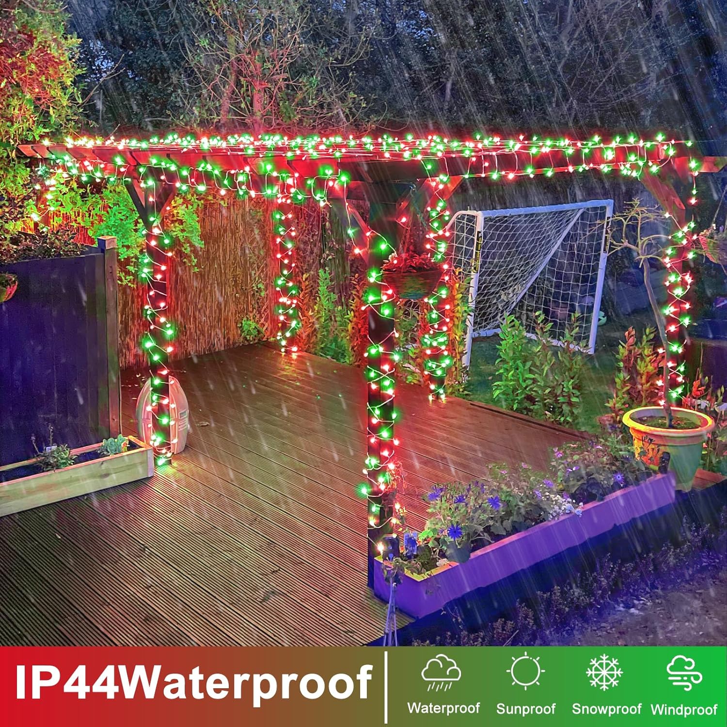 - Waterproof Fairy Lights Plug in: The red and green Christmas lights design with IP44 outdoor waterproof, can withstand wind, snow, rain and extreme weather. String lights are equipped with a UL certified 29V low-voltage plug ensures the safety. It's safe for family with kids or pets!