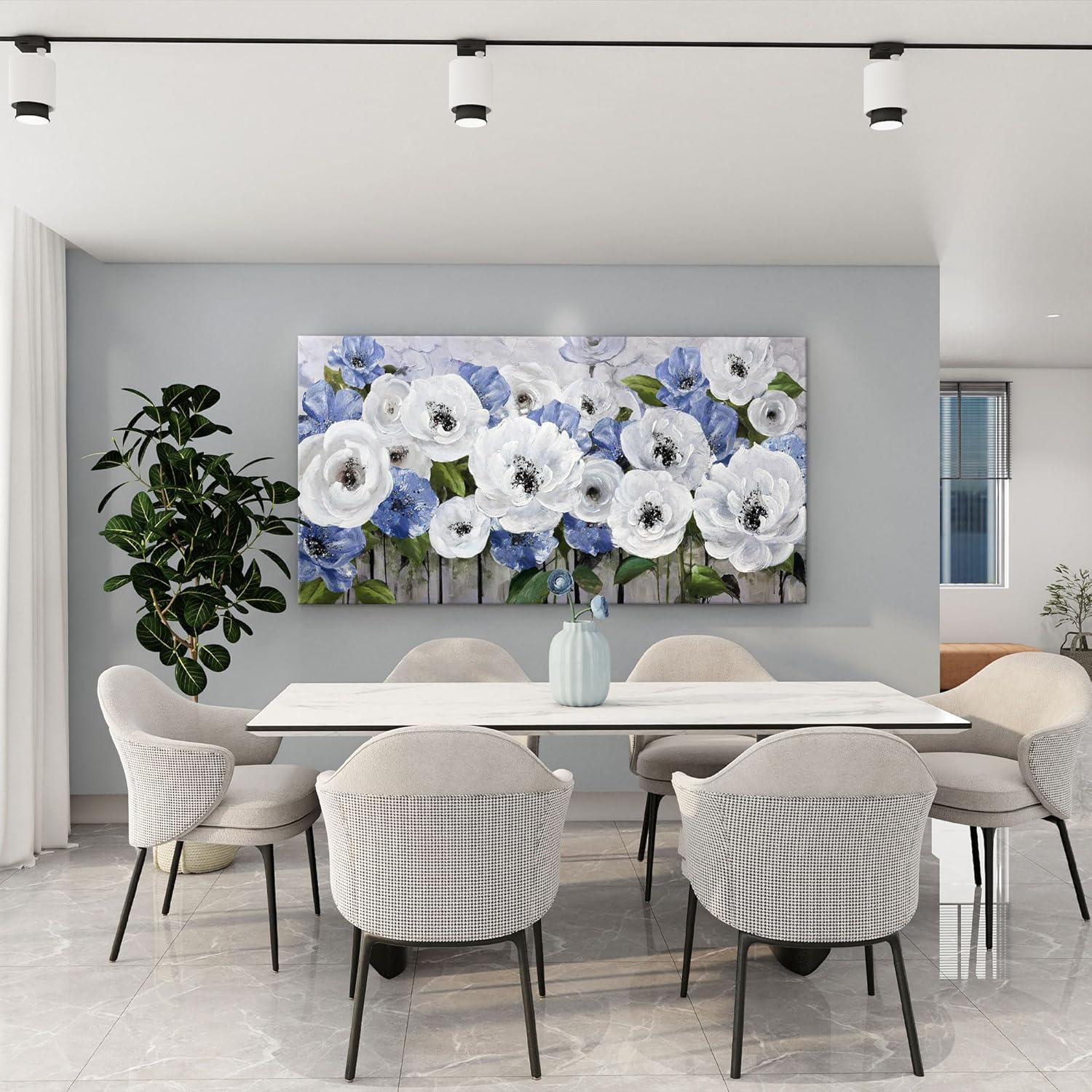 Large Canvas Wall Art for Living Room, Blue and White Textured Floral Wall Art, Flower Wall Pictures and Paintings, Nature and Landscape Artwork, Bedroom Wall Decor