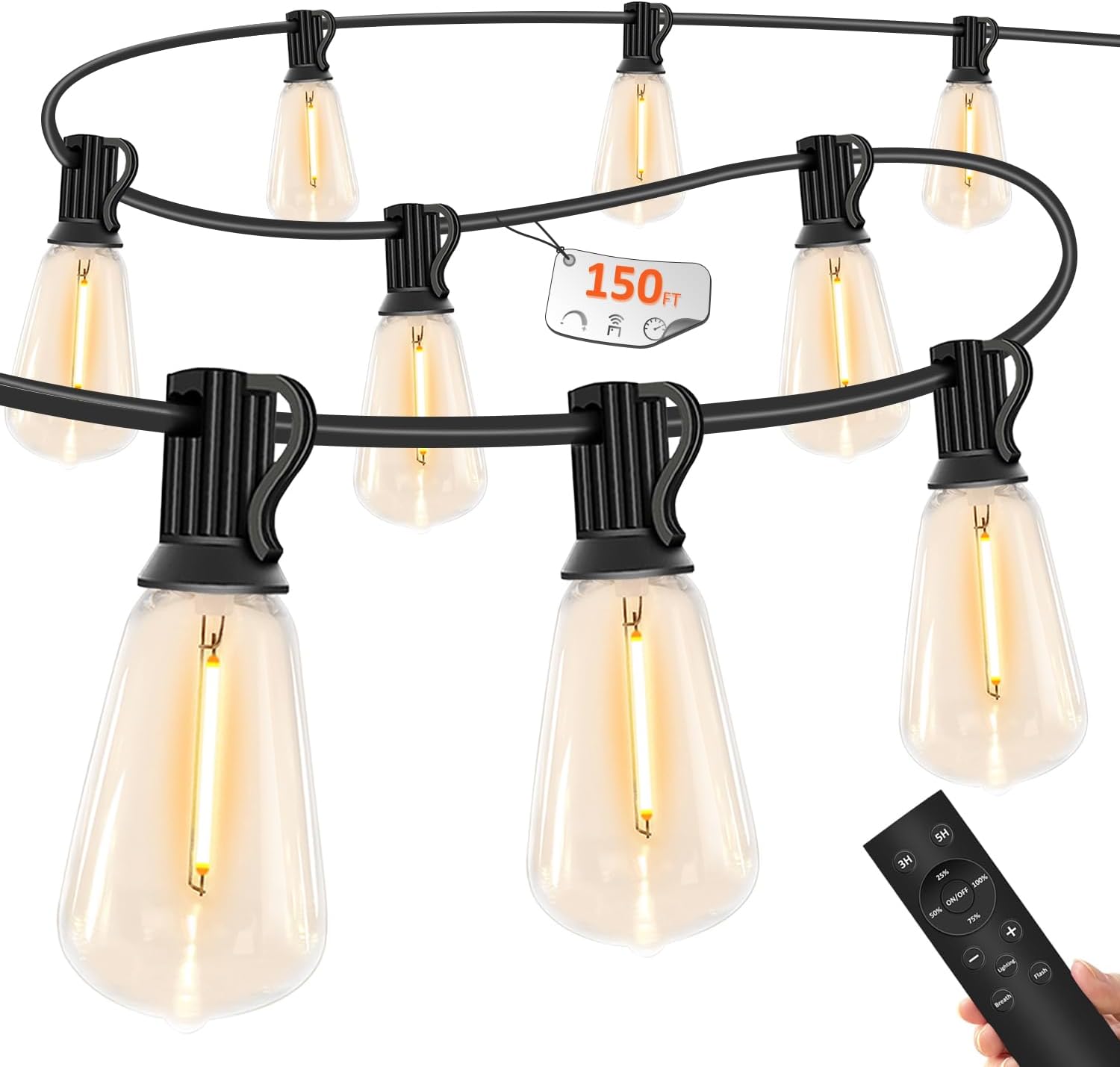 150 FT Outdoor String Lights for Outside – LED Patio Lights Waterproof with Dimmer Remote – Hanging Lights Shatterproof ST38 Vintage Edison Bulbs Porch Backyard Cafe Bistro
