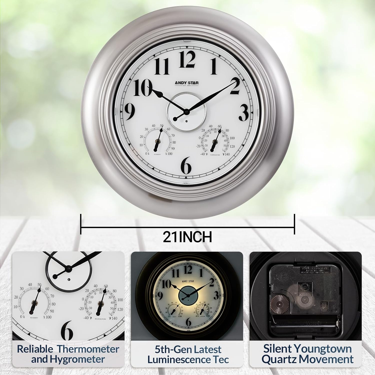 Andy Star 21 Inch Silver Illuminated Outdoor Wall Clock Waterproof with Thermometer and Hygrometer, Oversized Battery Operated Round Wall Clock, Big Silent Non Ticking Clock for Patio Pool Garden
