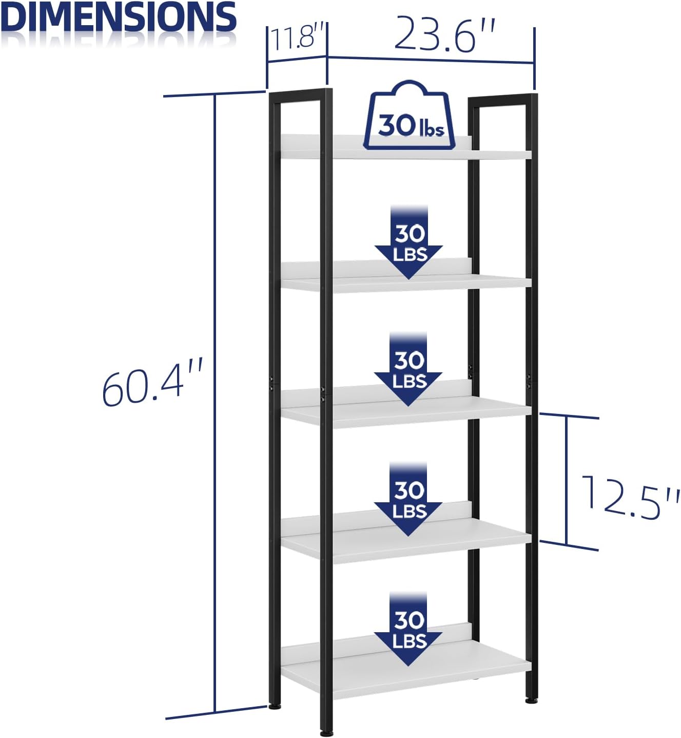 - 【5-TIER OPEN MULTIFUNCTIONAL BOOKSHELF】This 5 shelf bookshelf provides a very wide storage space, you can use it to place all kinds of items as you see fit. Books, photo albums, crafts, potted plants and etc. Beautiful bookshelf panel with waterproof and anti-scratch features, very easy to clean. Overall size: 23.6 * 11.8 * 60.4 inches (L * D * H)