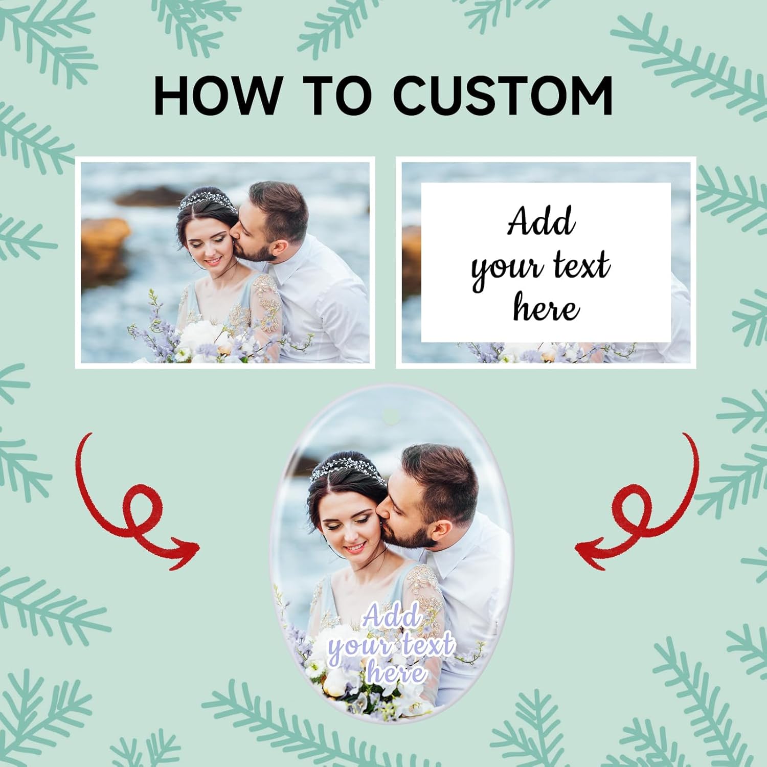 - 【Custom Photo Text Christmas Ornaments】Click on the " Customize Now " button to design your own Christmas ornament special with desired Photo, Picture, Logo, Text. Simply upload any photo, fit by the corners. Choose your font color, fill in the optional blank with your text. Our designers will do the rest.