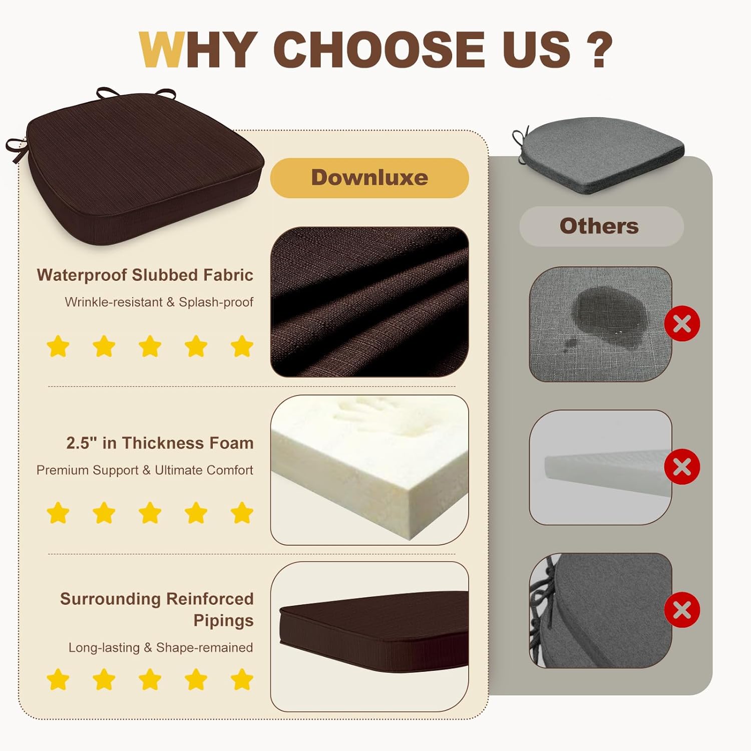 downluxe Chair Cushions for Dining Chairs, Waterproof Kitchen Chair Pads, Non-Slip Dining Seat Cushion with Ties, 17" x 16" x 2.5", Brown, 6 Pack