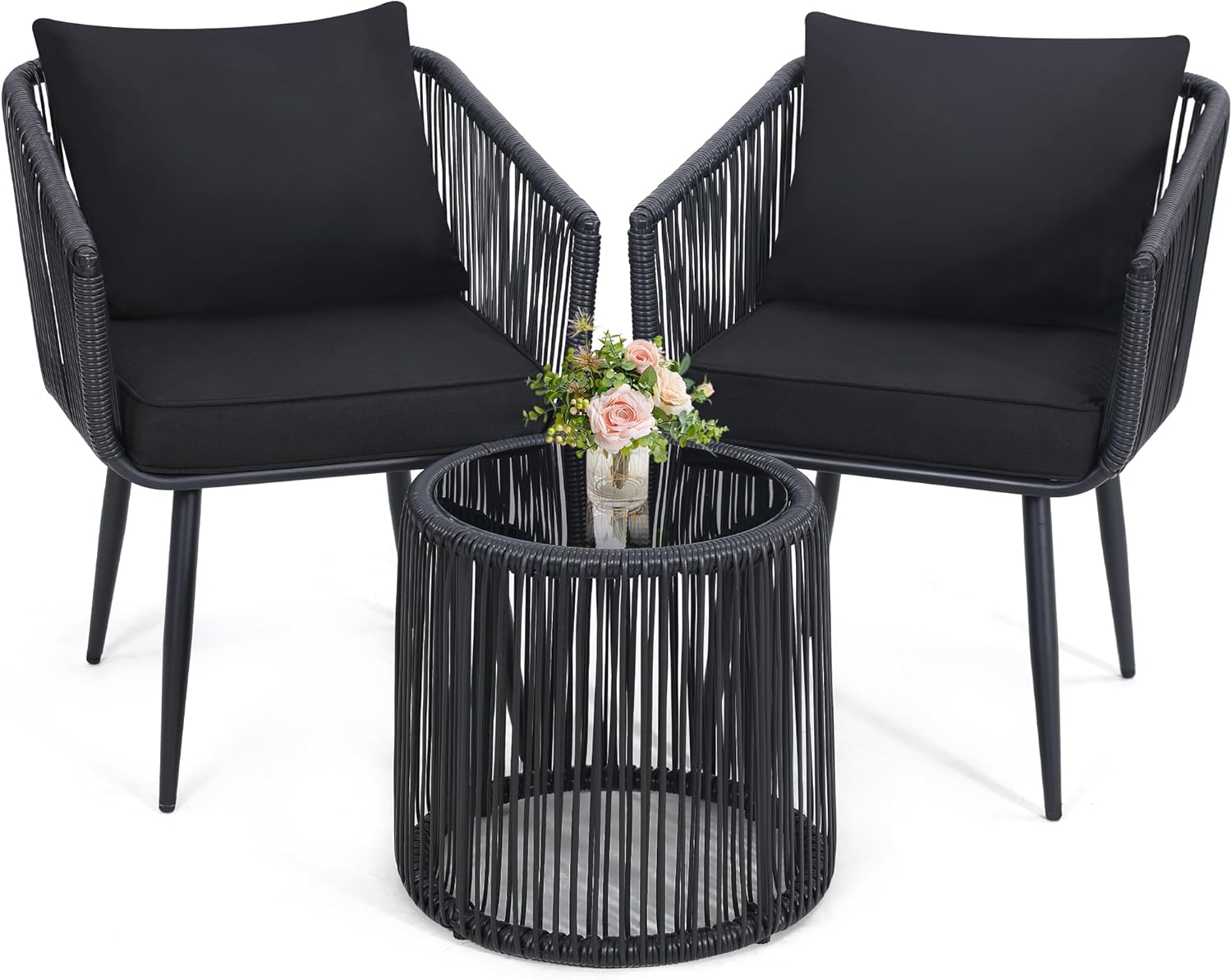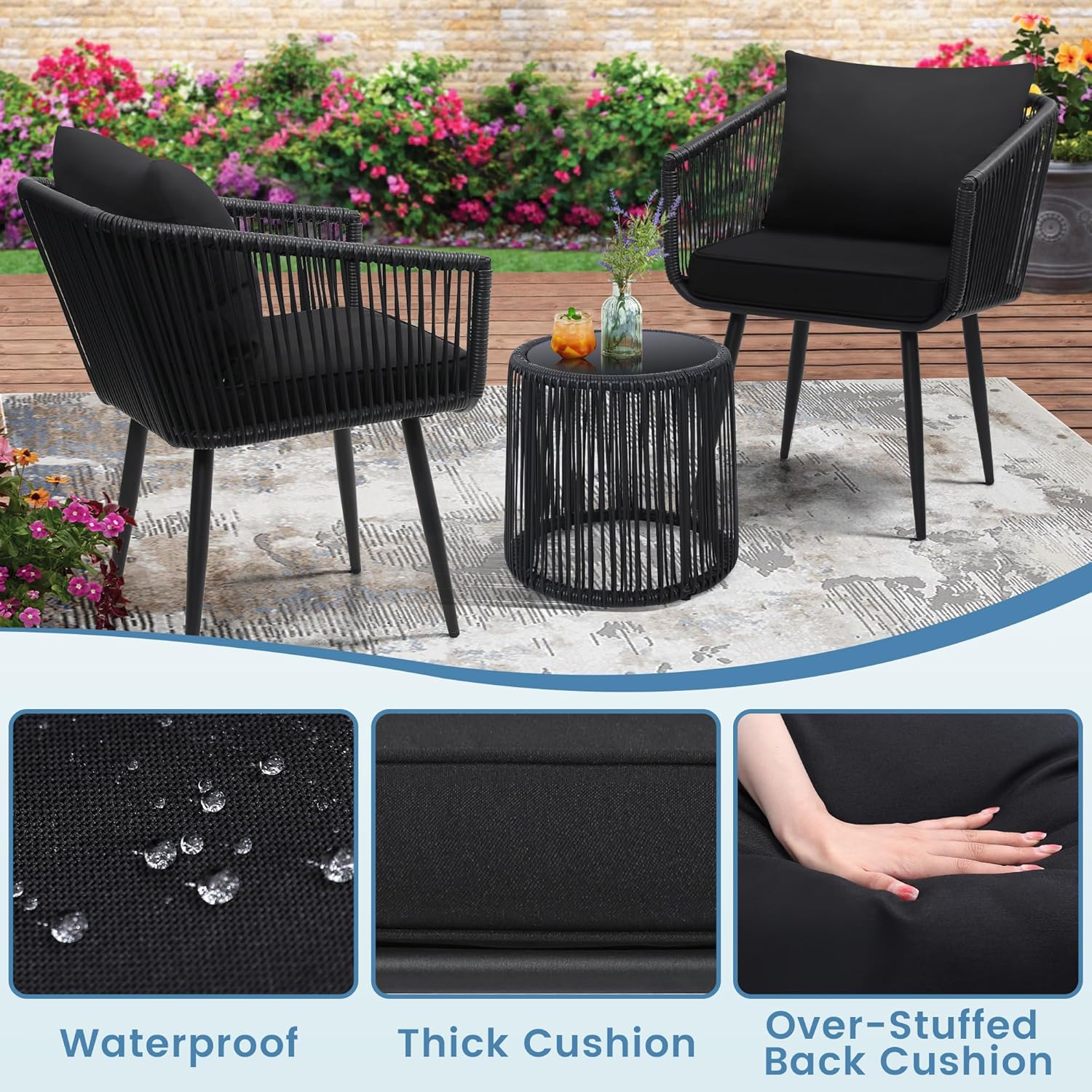 - 【WHATS INCLUDED】 Each 3 pieces bistro conversation set includes 4 overstuffed waterproof zippered cushions, 1 cocktail table with a tempered glass top, and 2 boho style indoor outdoor chairs.