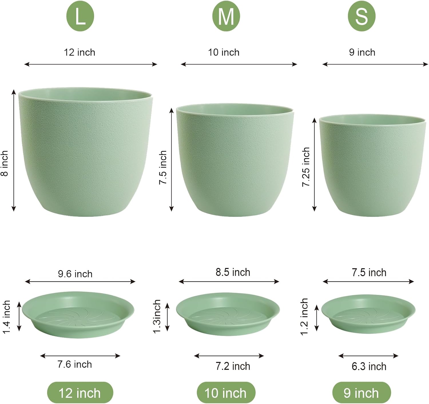 Large Plant Pots 12/10/9 inch, Set of 3 Modern Decorative Plastic Planters with Drainage Holes and Saucers, Flower Pots for Indoor Outdoor Plants, Green