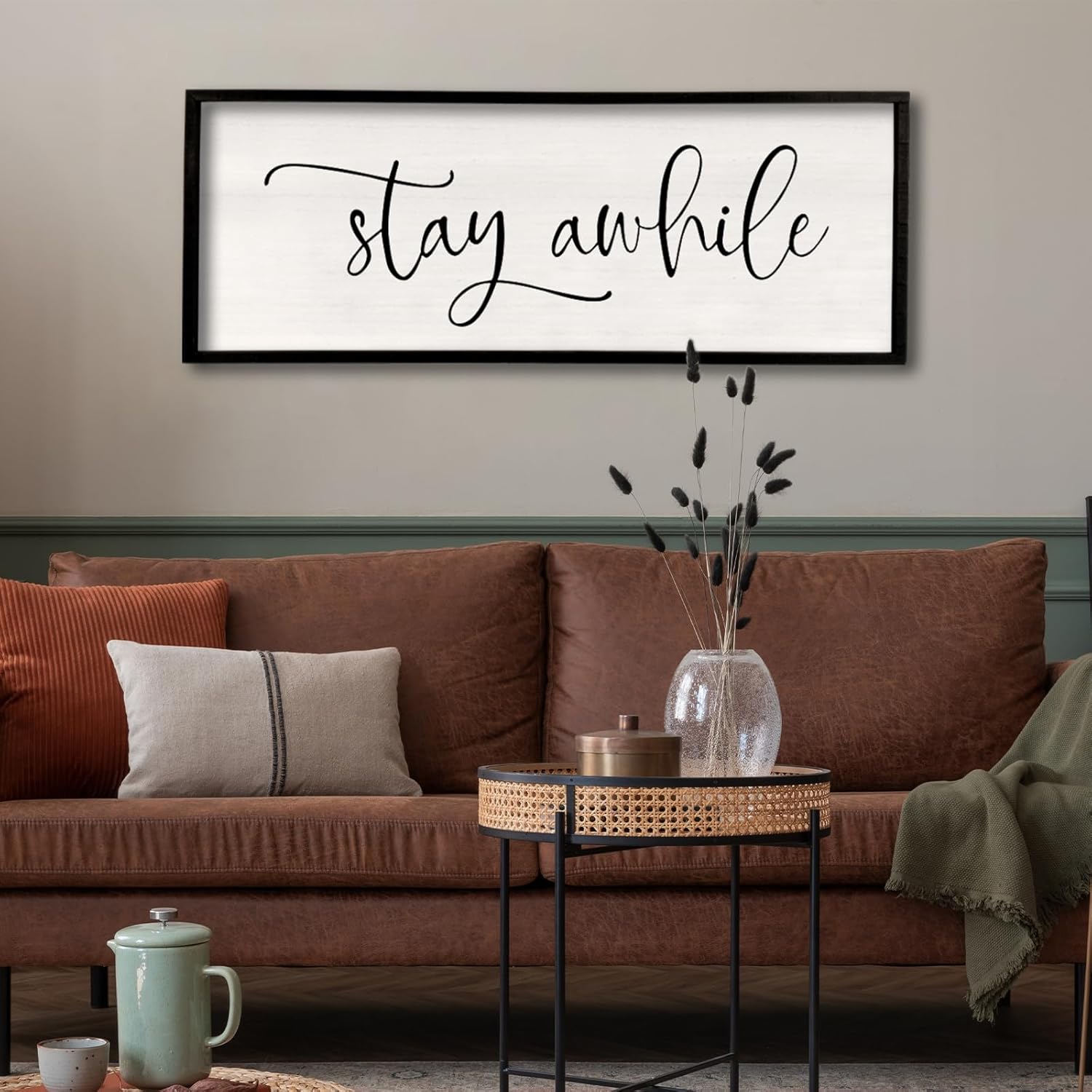 Stay AWhile Sign Wall Decor Sign 40"X15" Large Living Room Entryway Wood Framed Rustic Wall Decor for Vintage Farmhouse Foyer Hanging Lets Stay Home Wall Art (Black)