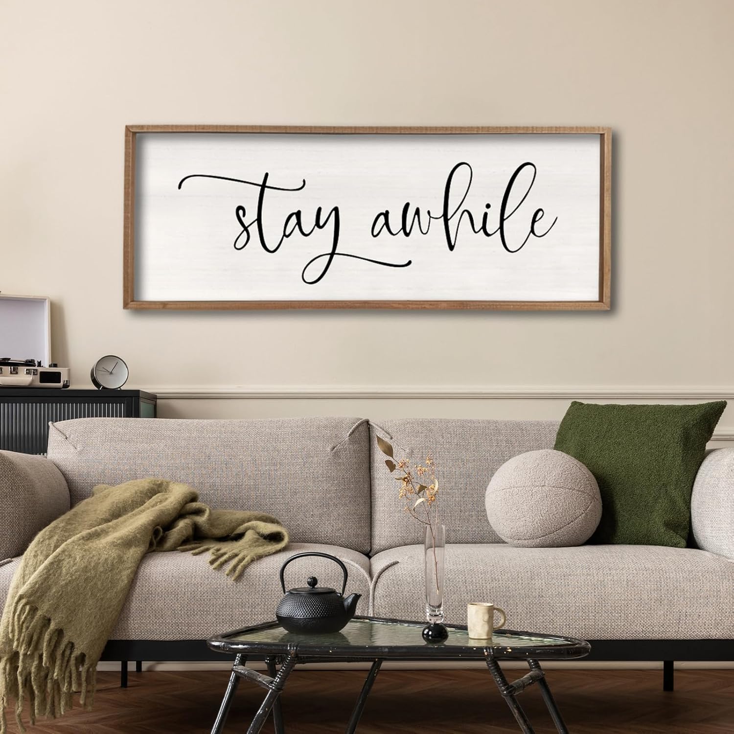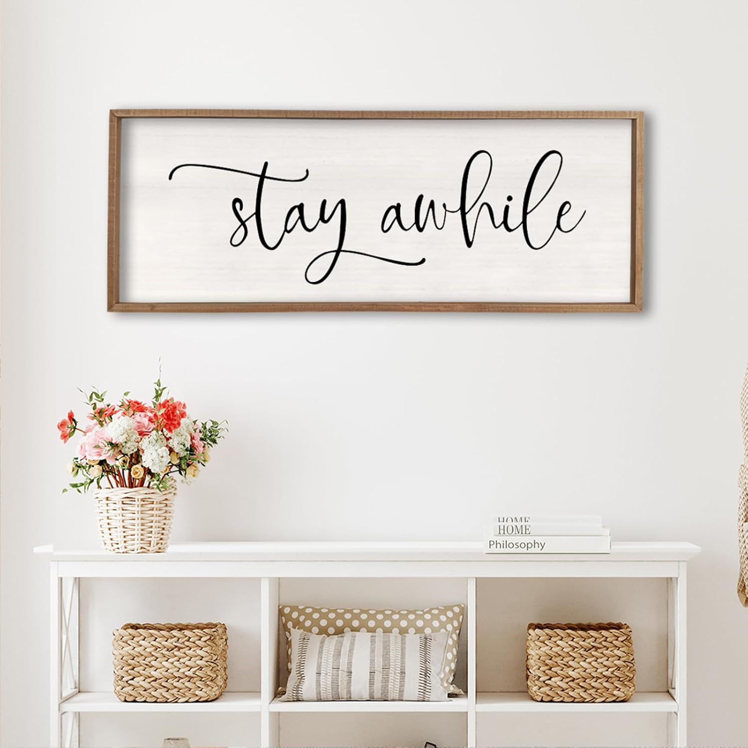 Stay Awhile Sign Wall Decor Sign 40"X15" Large Living Room Entryway Wood Framed Rustic Wall Decor for Vintage Farmhouse Foyer Hanging Lets Stay Home Wall Art (Wood)