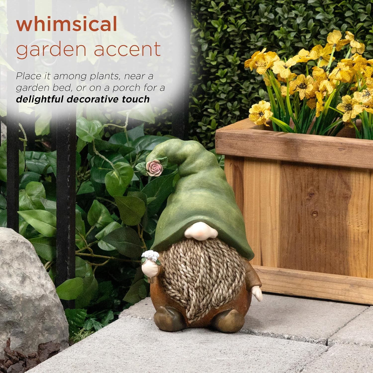 - CUTE GARDEN DECOR: This sweet gnome is topped with a green hat and holds a cute flower, showcasing nature-inspired charm