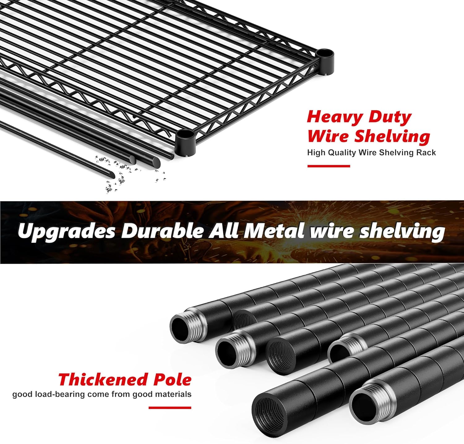 - 【1500 LBS Capacity Super Sturdy Storage Shelves】This Metal shelves for storage made of heavy duty steel wire,and has undergone special coating treatment. Every solid thickened industrial shelving with extra stiffener, can easily bear 300LBS a total of 1500 lbs bearing capacity. which means this metal shelving units and storage will always be your reliable partner.
