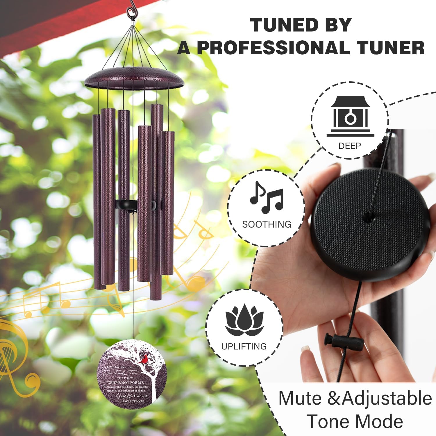 - ELEGANT WIND CHIMES: Professional tuning gives a steady deep and mellow tone that emits a soothing melody like church bells in the breeze. The wind chime comes with an adjustable tube design that allows you to fine-tune the tone as you like. The nylon rope is treated with high-density front treatment, perfect for bearing the weight of the wind chime.