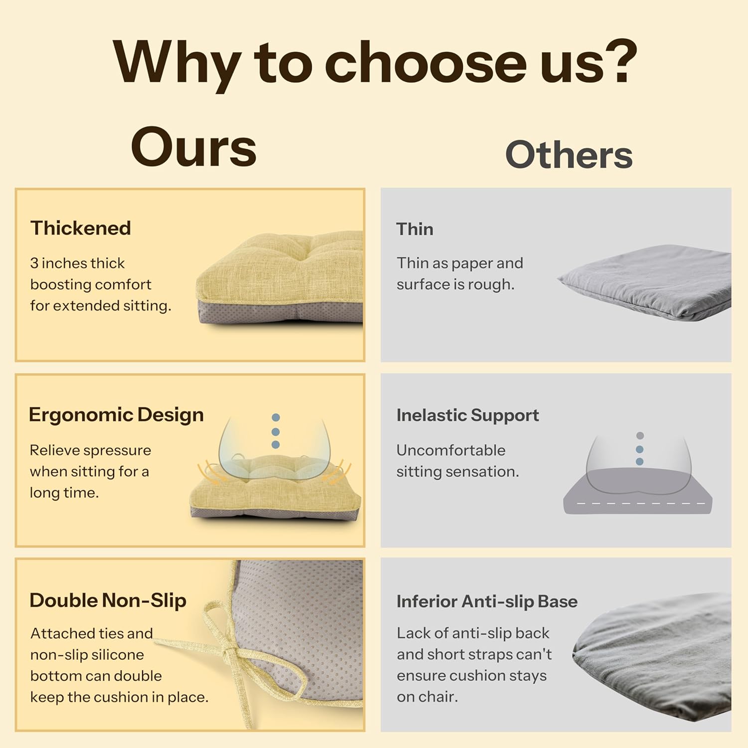 - Enhanced Support & Premium Filling: Our dining room chair cushions offer double the comfort with high quality cotton filling that offers superior comfort and support, relieving pressure on your hips and tailbone during extended seating. The chair cushions are tufted to prevent foam clumping. Perfect for extended sitting whether at the desk or dining table it combines comfort with ergonomic support.