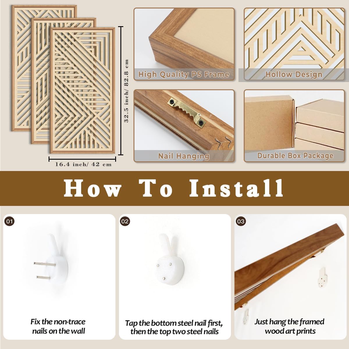 - 【High Quality Material】This beige mid century modern wood wall art framed is made of healthy and non-toxic natural wood. We use laser processing technology to make hollow patterns. Wooden geometric wall art is strong and does not fade or deform easily. The edges are polished smoothly and won't hurt your hands.