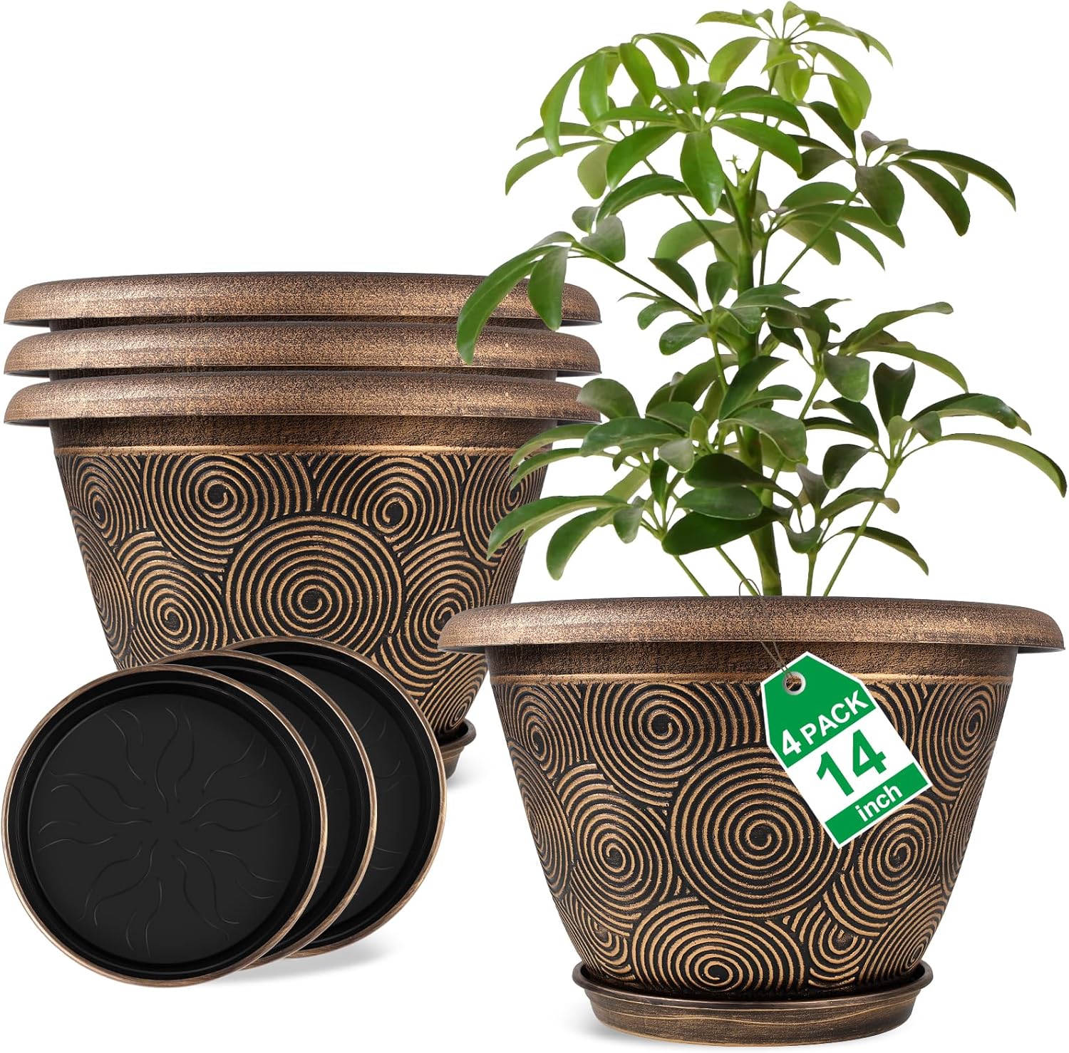 14 Inch Large Planter Pot for Plants Indoor Outdoor, 4 Pack Plastic Flower Pots with Drainage Hole & Tray, Modern Decorative Garden Pot with Saucer, Plant Container for House