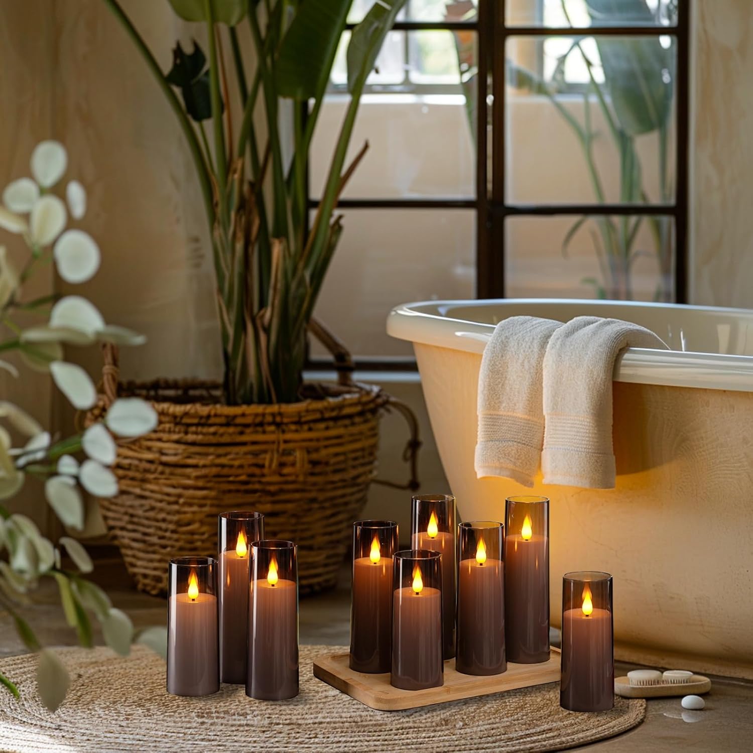 Amagic Grey Flameless Candles 9 Set, Battery Operated Candles with Remote Control and Timer, Flickering LED Pillar Candles for Home Halloween Decor, 3D Wick, Warm Yellow Light, D2.2 xH5 6" 7"