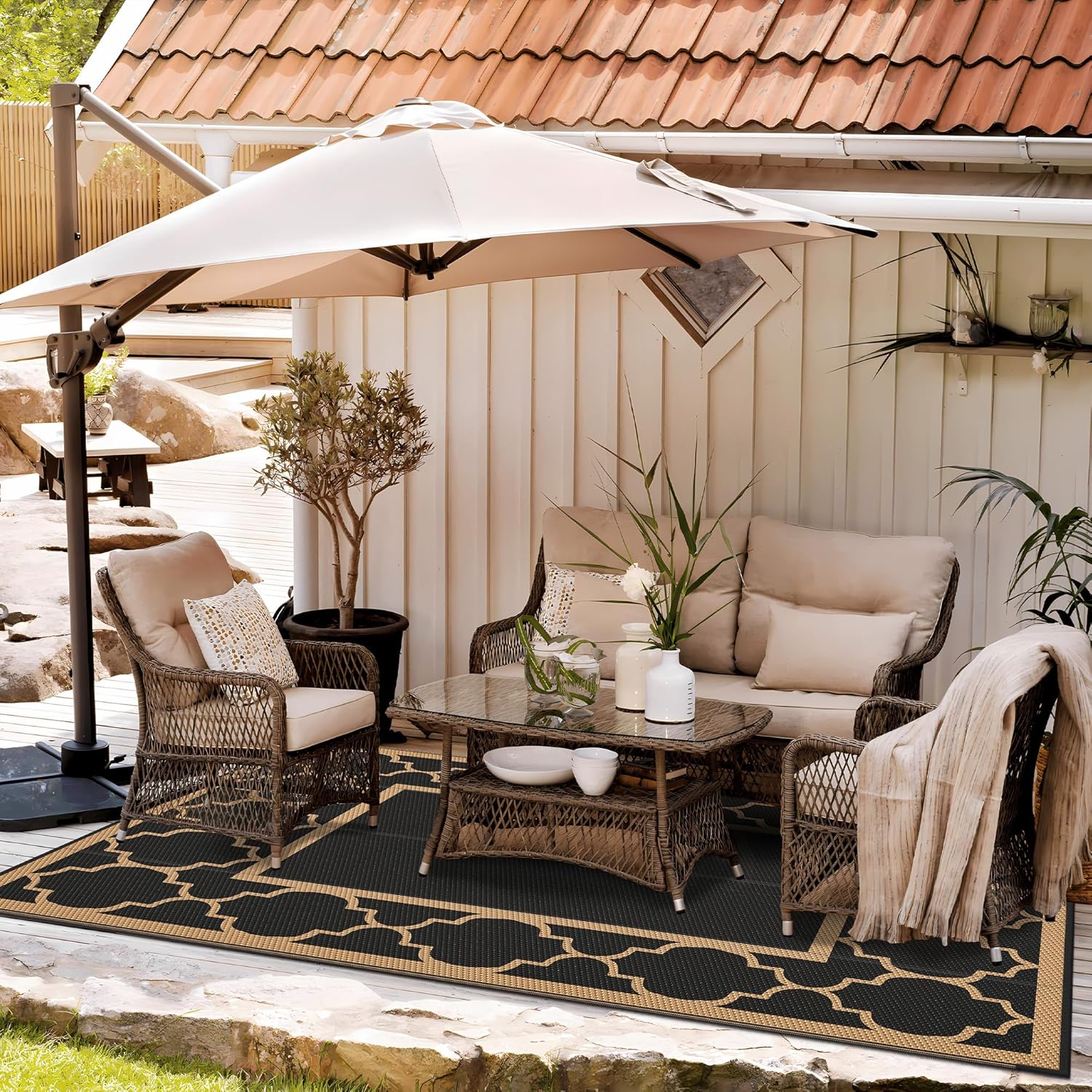 GENIMO Outdoor Rug 9' x 12' Patio Waterproof, Foldable Reversible Plastic Straw Area Rugs Mat for Camper Decor, Outside Carpet for Rv, Deck, Porch, Picnic, Beach, Balcony, Black & Brown