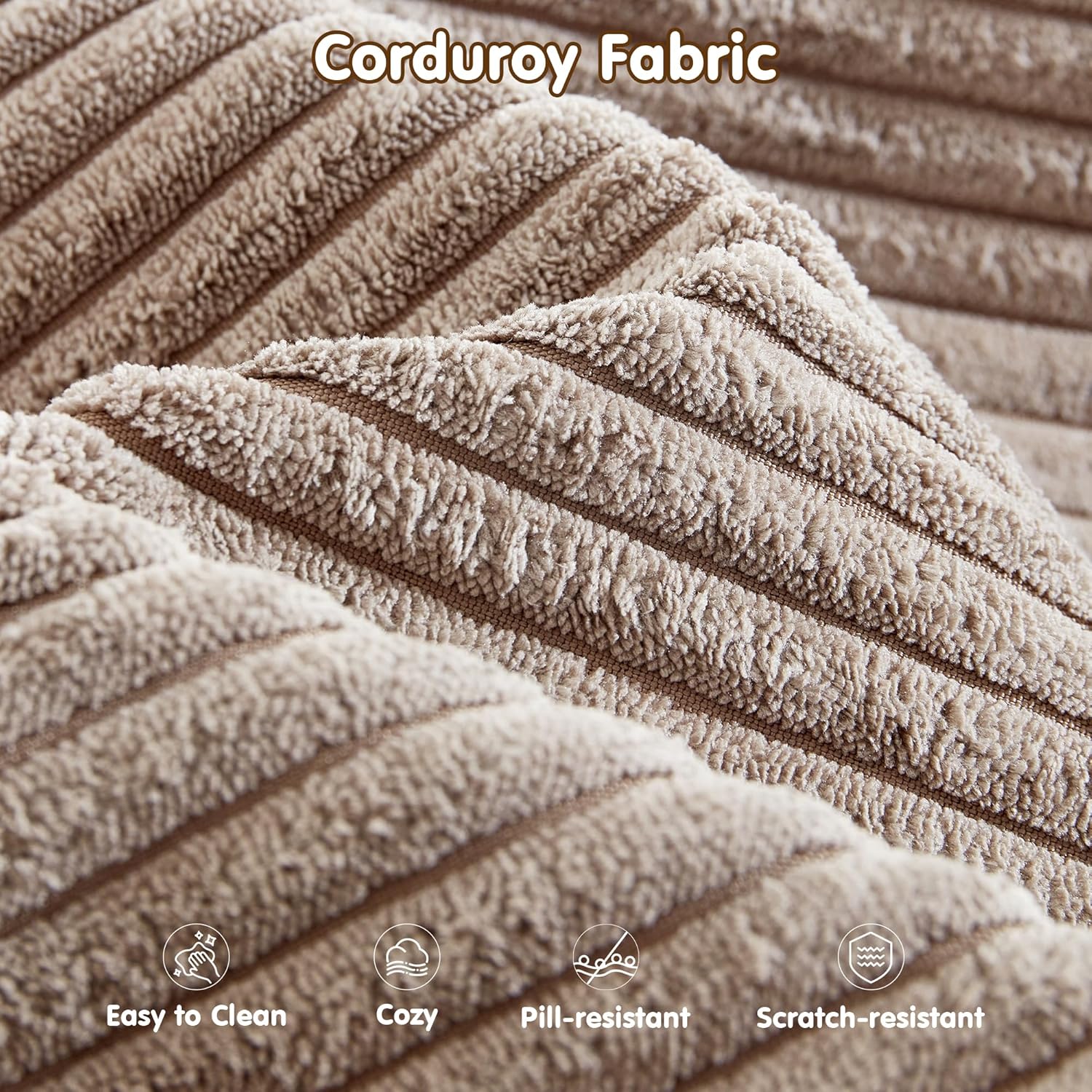 - Corduroy Fabric:Experience the lavish comfort of our enhanced corduroy fabric, offering unmatched softness and warmth. Its impressive durability and stain-fighting prowess keep your sofas looking fresh and lively. With a variety of color choices, our corduroy chaise sofa lets you showcase your unique style while adding irresistible charm to your space