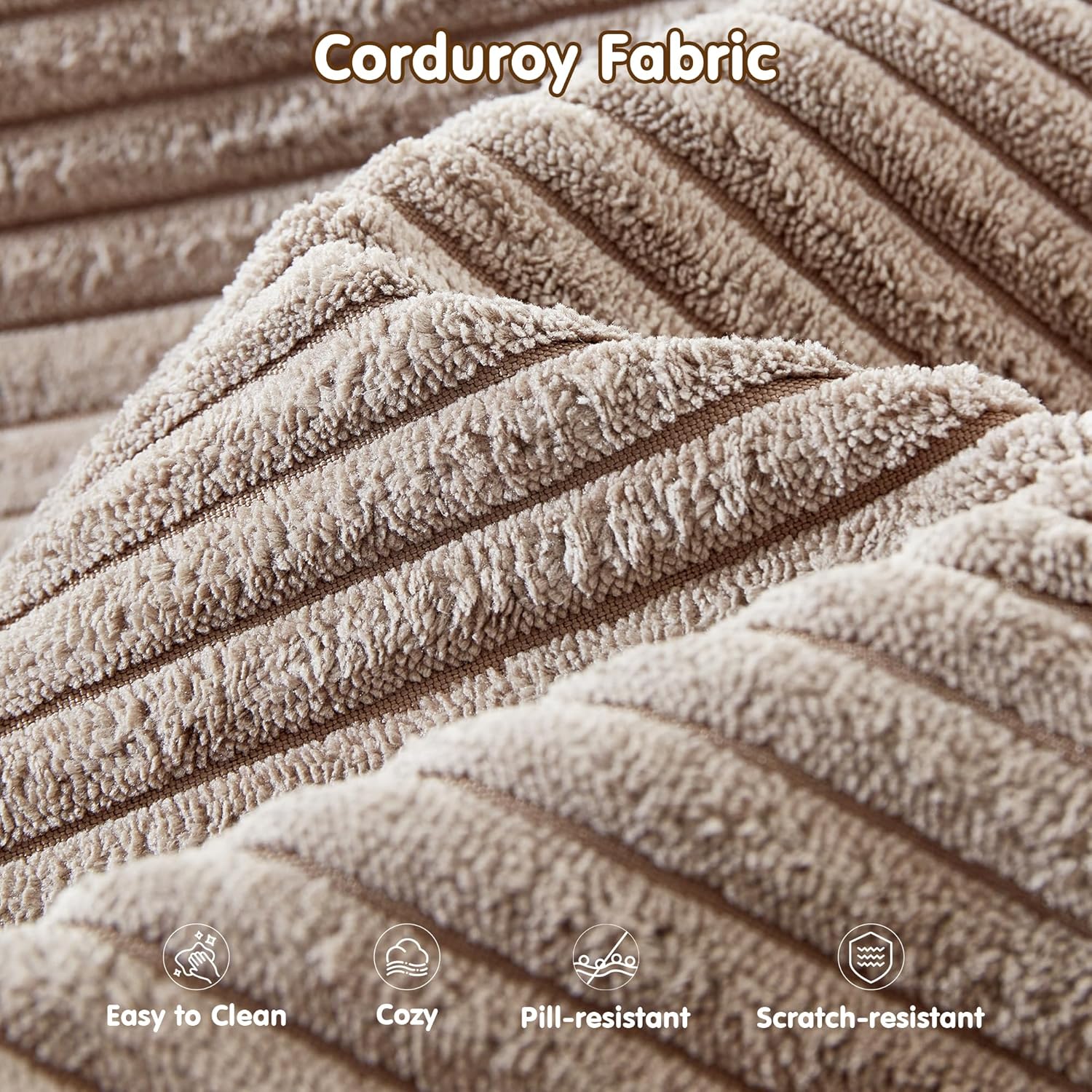- Corduroy Fabric:Experience the lavish comfort of our enhanced corduroy fabric, offering unmatched softness and warmth. Its impressive durability and stain-fighting prowess keep your sofas looking fresh and lively. With a variety of color choices, our corduroy chaise sofa lets you showcase your unique style while adding irresistible charm to your space