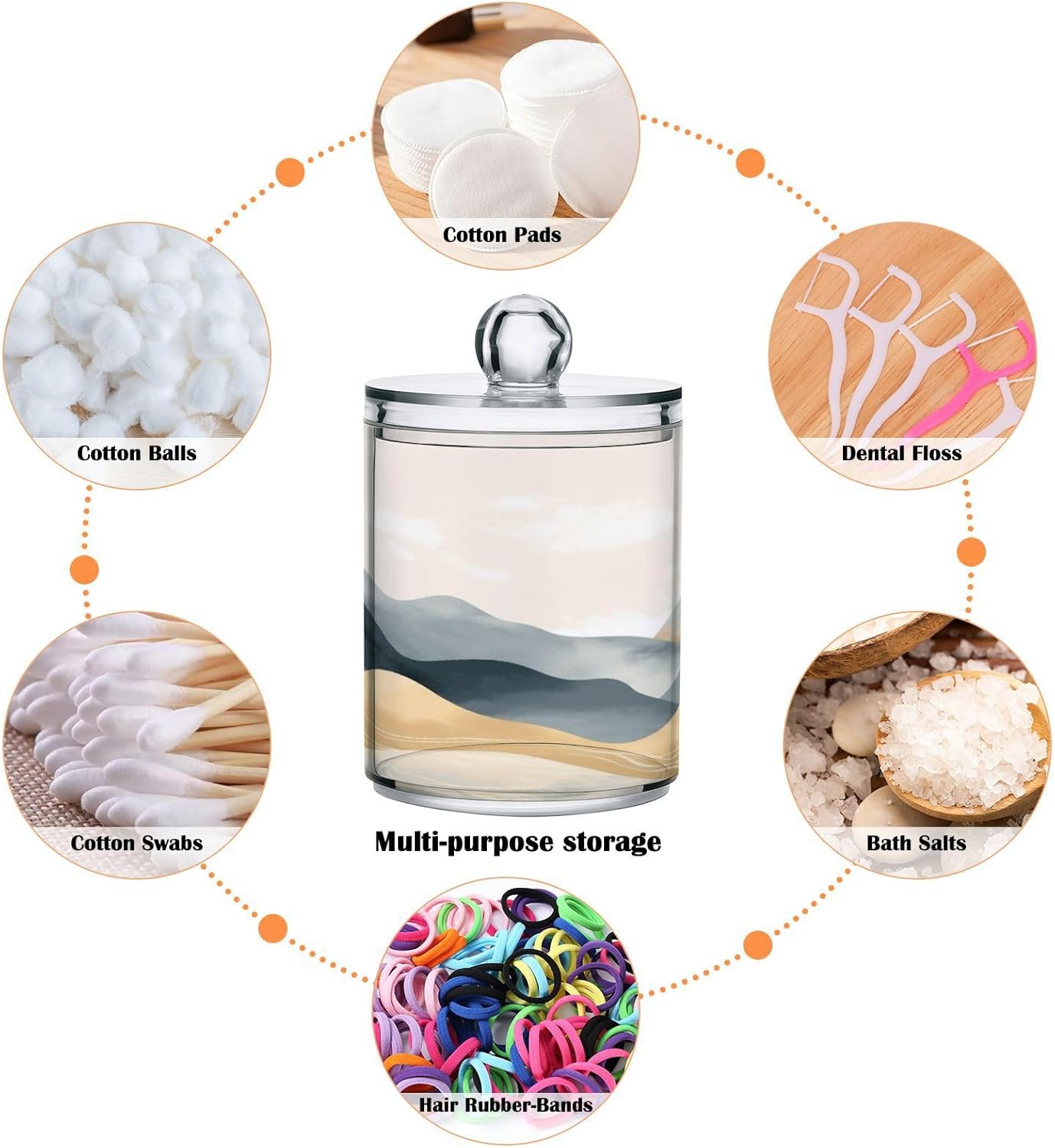 - EASY TO USE - As excellent bathroom accessories, you can easily open this storage canister with one hand. You can use these storage containers for organizing small items and keeping them neat and clean. Such as cotton balls, cotton swabs, cotton pads, beauty eggs, face brushes, floss picks, hair ties, bath salt, pens, clips, and more
