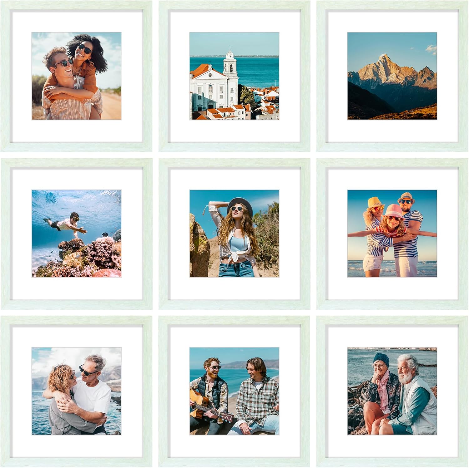 Vittanly 12x12 Picture Frames Set of 9, Shatter Resistant Plexiglass, Display 8x8 Pictures with Mat or 12x12 without Mat, Photo Frames for Wall Mount, Engineered Wood, Vintage Green