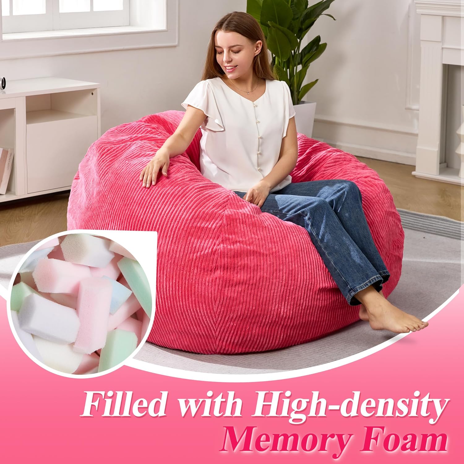 - COMFORTABLE & DURABLE FABRIC: Our bean bag chairs are made of textured corduroy, which is skin-friendly. The cover can be machine washable so that you can clean it like new. The filled memory foam is high-density, which is easily rebound and make you feel relaxed once you lie down or sit on the chairs.
