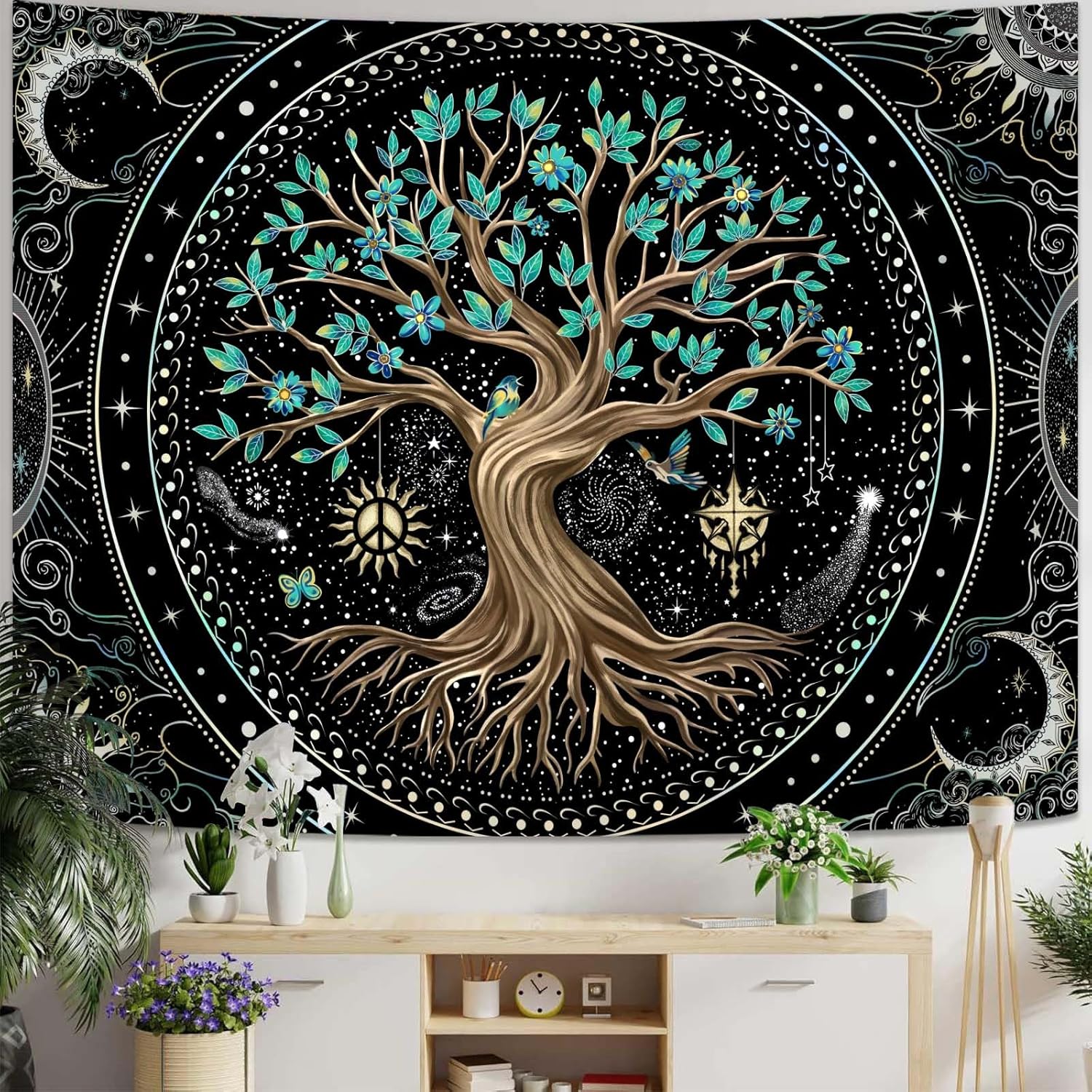 Lunerfex Tree of Life Tapastry Butterfly Moon Tapastry Flower Green Tree Tapestries Mandala Wall Hanging for Bedroom and Living Room Decor 60×80 Inches
