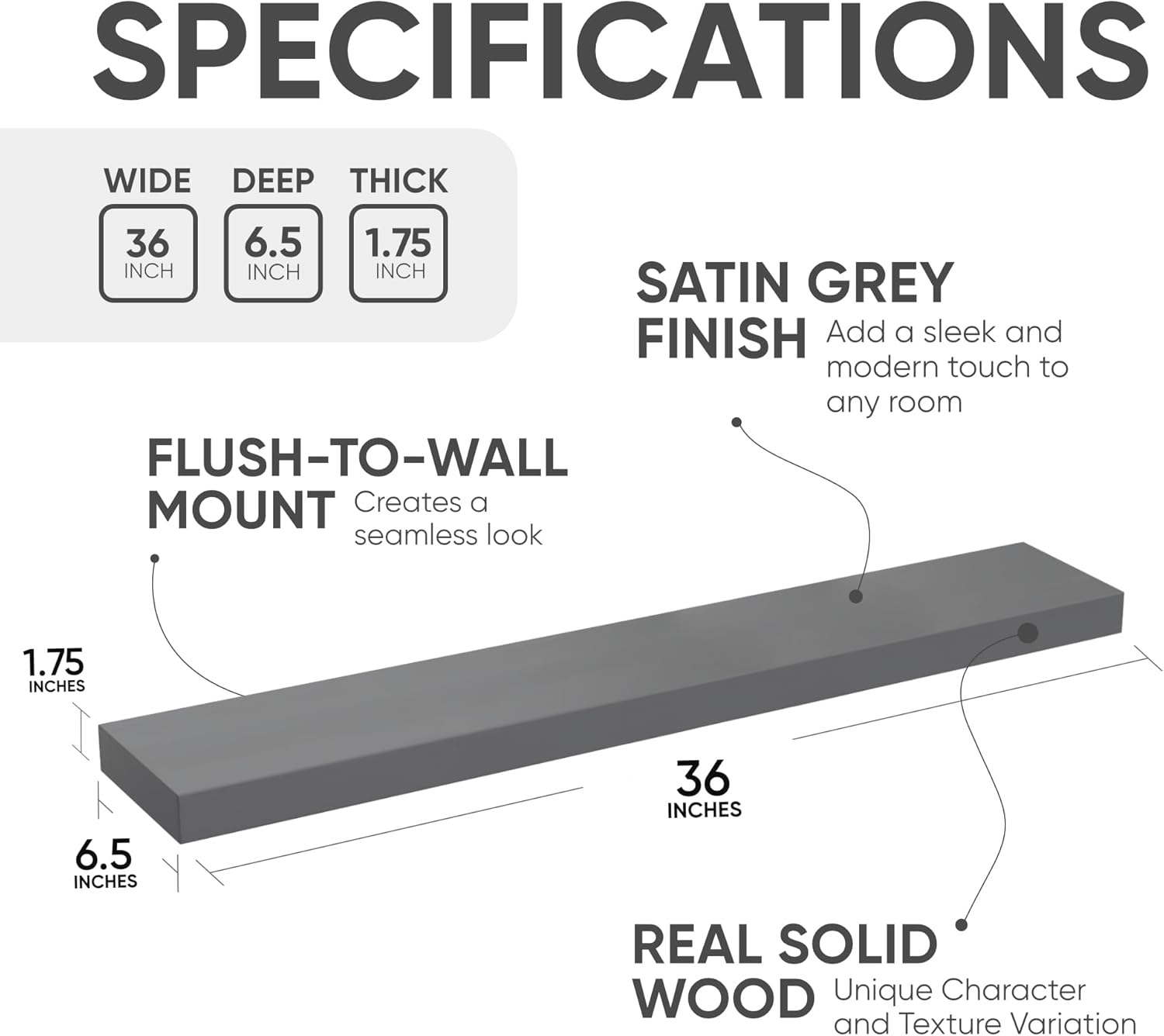 - AUTHENTIC WOOD GRAIN - Enjoy the timeless elegance of real wood. Handcrafted from the finest 1.75" Thick natural pine wood measuring 36" Wide x 6.5" Deep x 1.75". Our shelves highlight the inherent charm and durability of high-quality wood. Each Shelf reveals its unique character of knots and natural wood grain; each ledge is a little different but equally stunning.