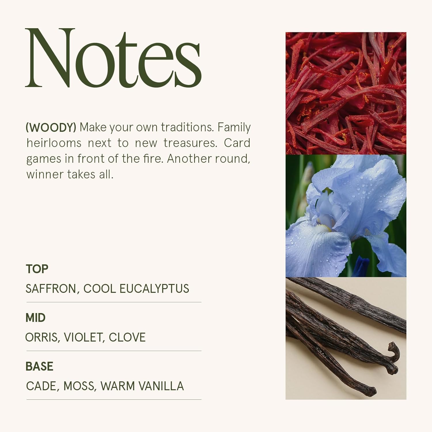 - HEARTH & VELVET - A captivating blend of saffron and fresh thyme evolves into a heart of velvety orris, raspberry, and violet, while a base of rugged cade, earthy moss, and warm vanilla lends depth to this aromatic fragrance