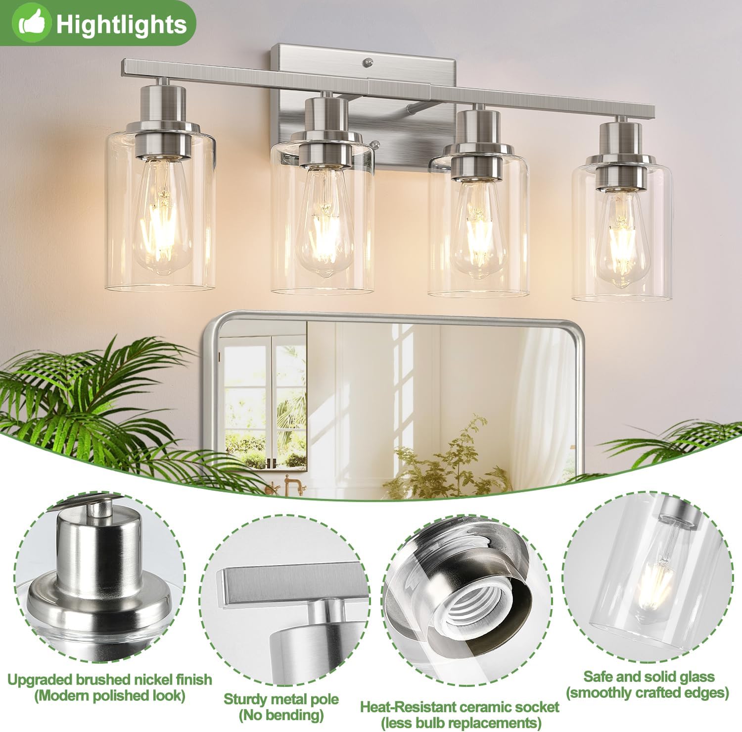- Timeless Brushed Nickel Design - Enhance your space with this 4-light bathroom fixture, featuring a brushed nickel metal body and thick clear glass shades. Its sleek, modern design complements farmhouse, contemporary, and traditional decor, making it a versatile and stylish addition to any room.