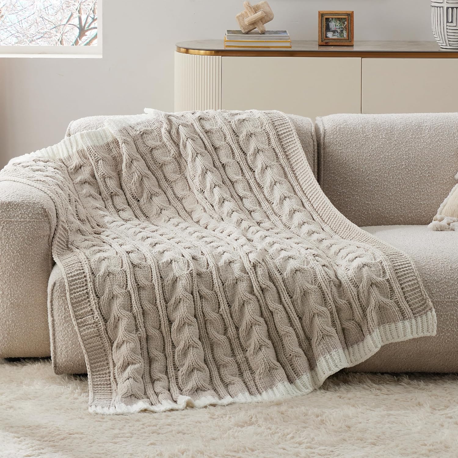 Bedsure Cable Knit Twin Blanket for Couch Bed - Breathable Chenille Chunky Knit Twin Blanket for Decorative Gift, GentleSoft Cozy and Warm for Winter and All Seasons, Beige, 60x80 Inches